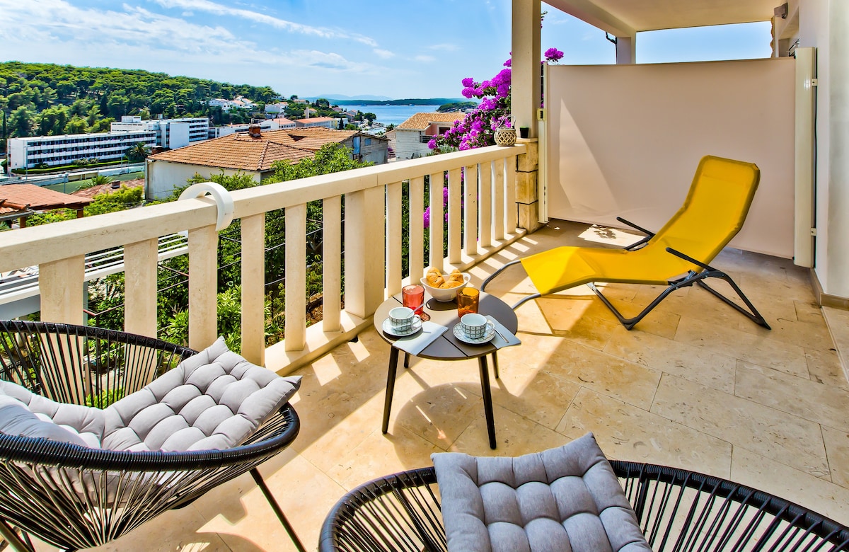 The cosy apartment is away from the party scene, noise, in a quiet, peaceful environment, about a 20 minutes walk from the down town Hvar. It offers an amazing view from the large terrace (reconstructed 2024) to the ocean. By the evening terrace offers a romantic candlelight dinner facing the sea under the moonlight. The apartment is all day sunny and grapevine pergola in the courtyard provide daily shade. Easy walk down the stairs to get the first-morning swim. The parking lot is guaranteed.