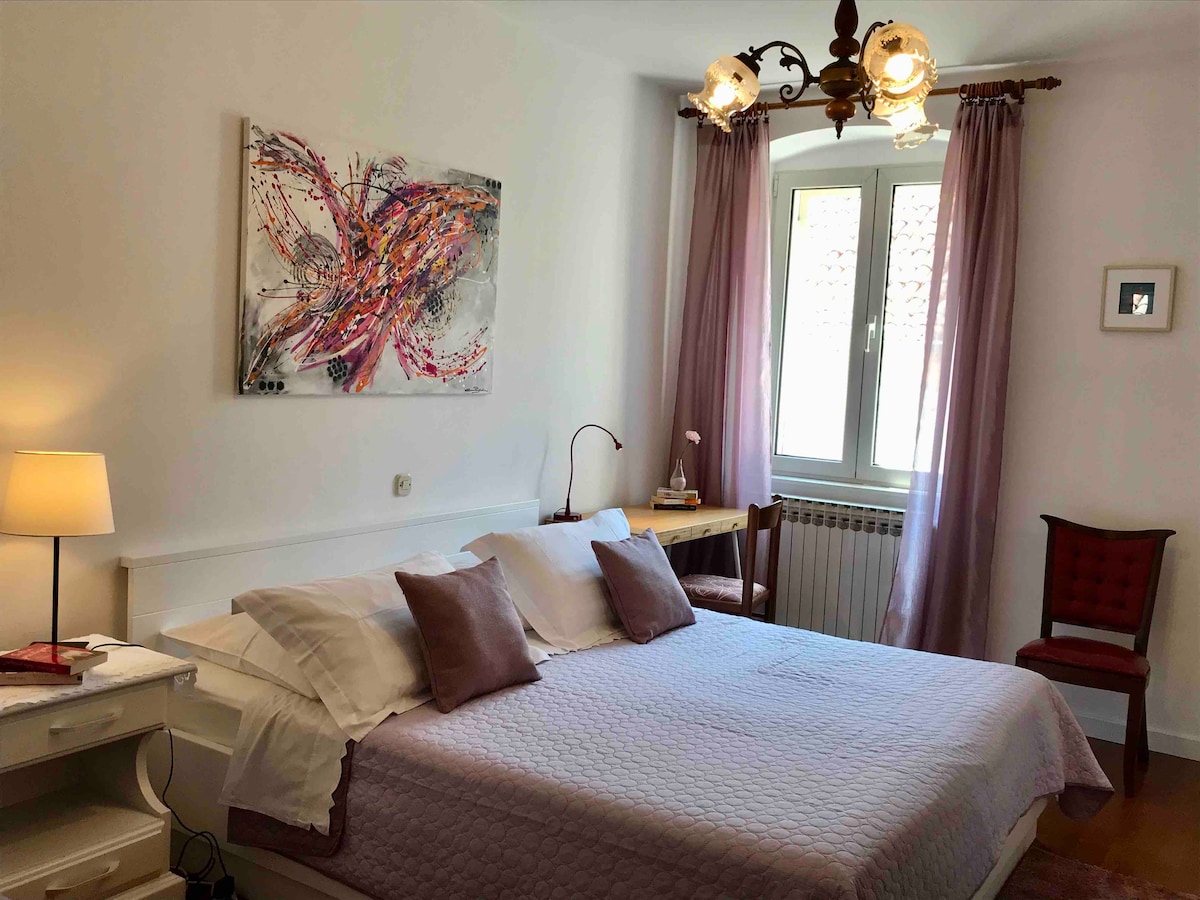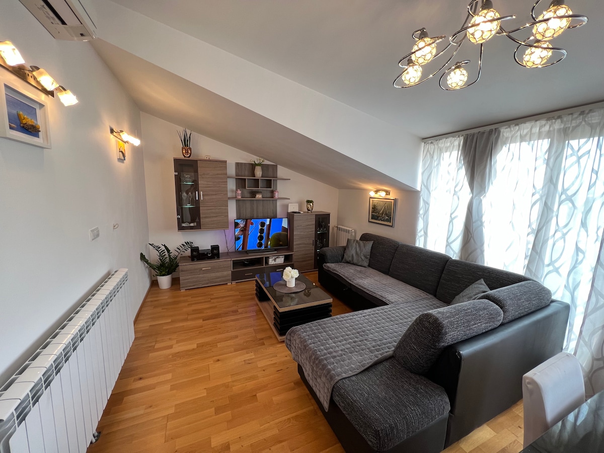 Apartman površine 60 m 2 sastoji se od spavaće sobe sa velikim bračnim krevetom, kupaone, prostrane dnevne sobe sa kuhinjom, predsoblja i balkona. Čitav južni zid prema moru je u staklu tako da prostor ima puno svjetla i sa balkonom čini jedan prostor. Apartman se nalazi na trećem katu kuće koja se nalazi u neposrednoj blizini centra grada (5 minuta ugodne šetnje uz more) te sa balkona ima otvoreni pogled na more i otoke budući se kuća nalazi u prvom redu uz more.