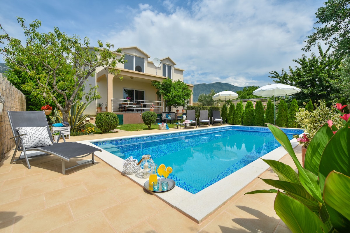 VILLA TISSA with big heated swimming pool, jacuzzi, big garden,free private parking, infrared sauna, mini gym, table tennis and park for the kids with trampoline, swings, toboggan, playstation 4.. House consists of 2 connected objects, fully equipped with a beautiful view at the sea, local islands and mountain from the north side, free Wifi internet connection...