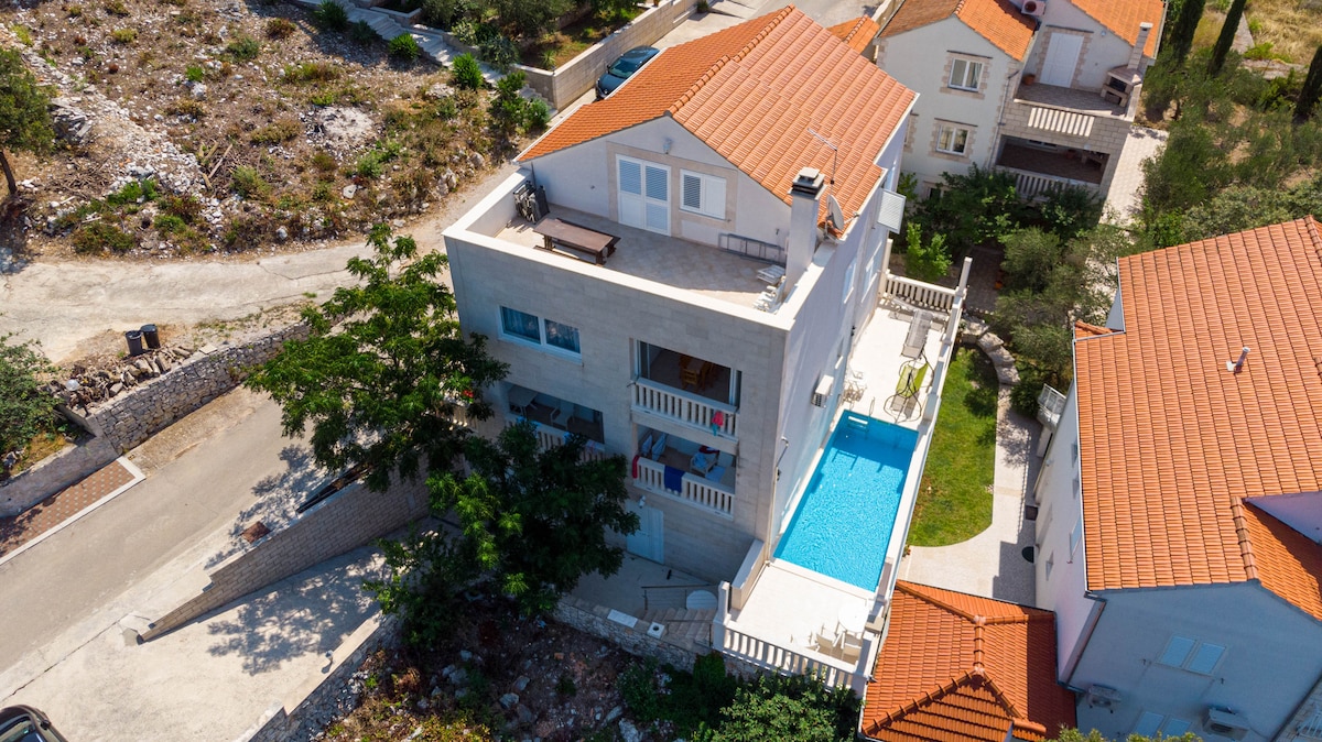 This holiday house with pool is situated in 4 km from the Korcula town and 150 m from the sea. House is located on a hill with spectacular views of the sea and surrounding islands, where you can enjoy in privacy and peace on the spacious covered terrace. . House is ideal for family of 4 or couples and consists of kitchen, living room, extra sofa, bedroom, additional bed, bathroom,fireplace and parking place. The house own a water tank and has solar energy system which requires a carfull usage .
