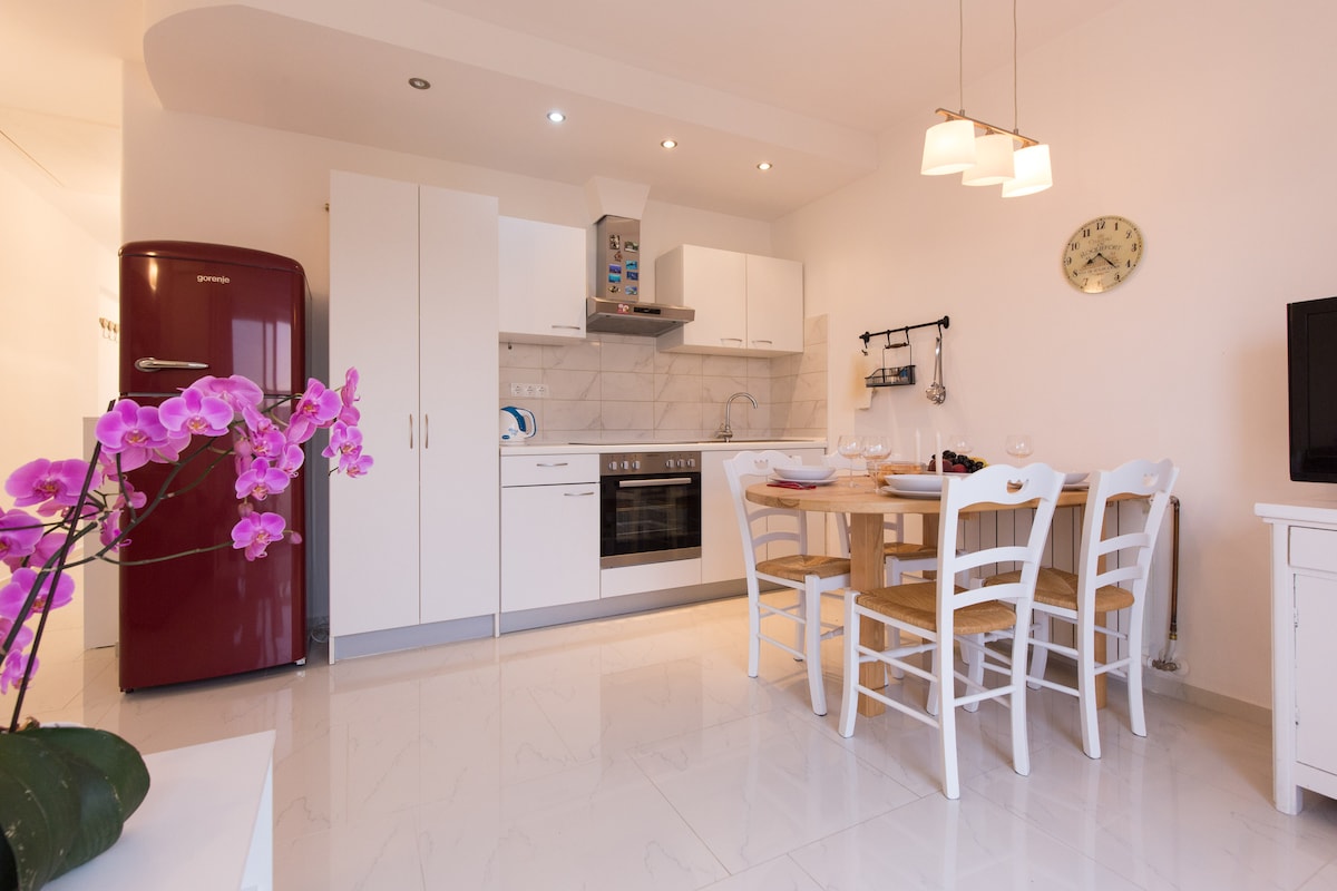 Aida apartment is centrally located, beautiful beaches and cultural heritage are on walking distance. This modern apartment occupies few levels, it consists of kitchen and living room on the ground floor with exit to the garden terrace and a toilette. On higher levels there are 2 bedrooms and a bathroom with a shower. There are some stylish details in the apartment such as hand made chandelier in the corridor. It is suitable for couples, solo adventurers, business travelers and families.