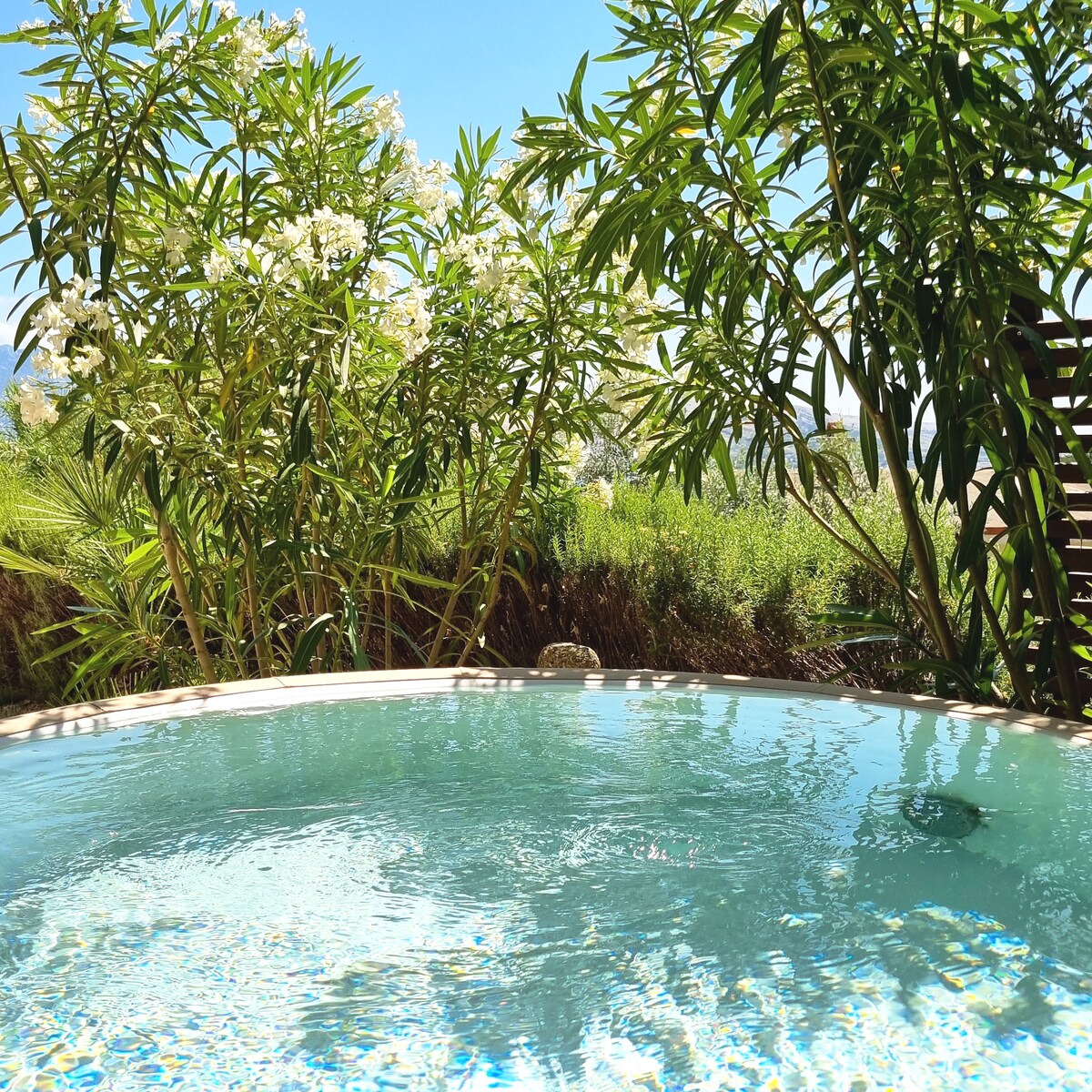 On the ground floor is an open space with kitchen, dining room and living room. The bedroom and bathroom are separated by a small hallway. The upper floor of the house/attic also has an open space with kitchen, living room and dining room. There are two bedrooms, one of which has a balcony. Upstairs is one bathroom and one toilet. In the garden is a pool with holiday furniture under the pergola, 8 sun loungers, parasols and an outdoor shower. There is a children's playground by the pool.