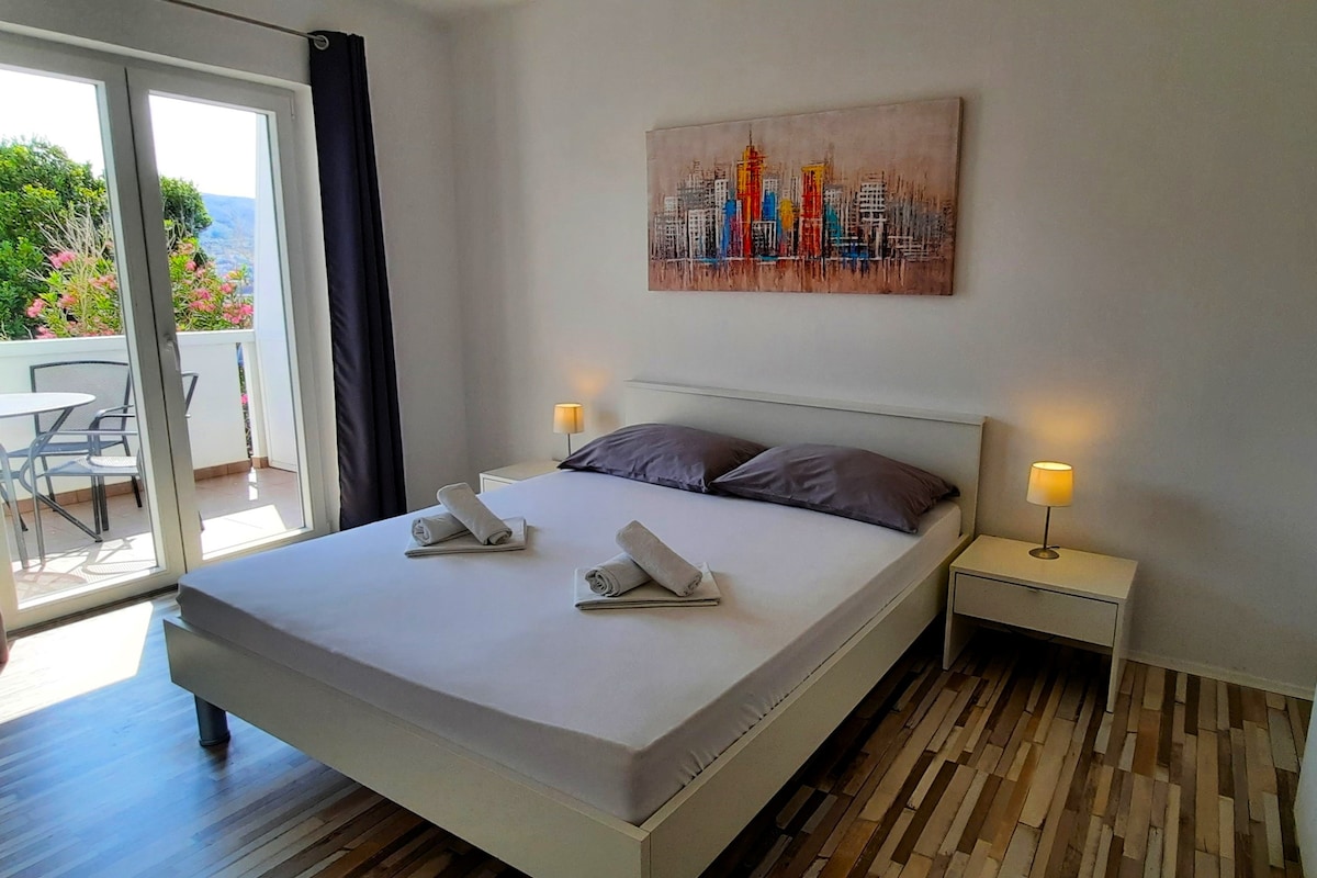 Our studio apartment comfortably suits up 2 persons and it is located in a quiet family area. The apartment is fully furnished and it has A/C, wifi connection and its own free parking lot. You can see the sea and the mountains from the balcony and the first beach is just down the hill. You can reach the city beach and the old town in 5 minutes by car.