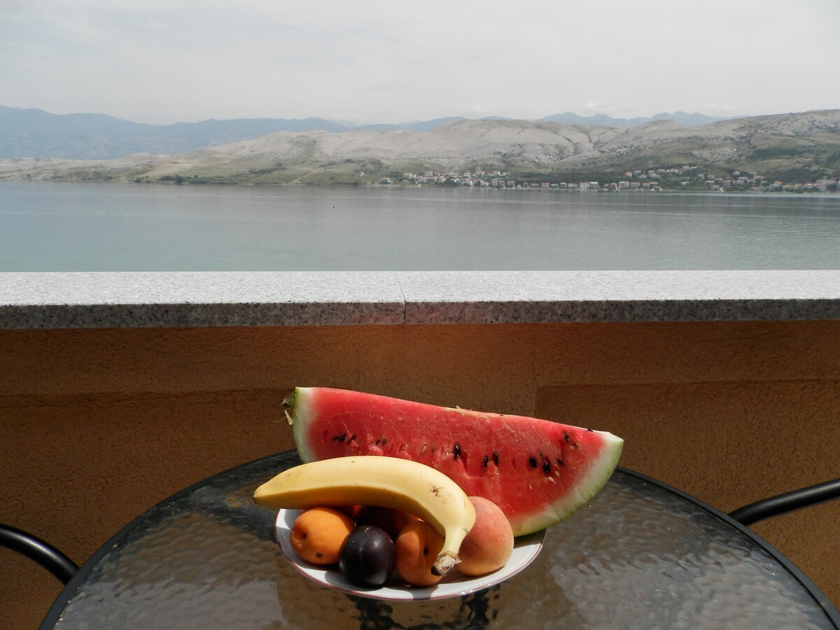 40 m² apartment with one bedroom and one bathroom. On the second floor with a balcony facing the Pag bay. The apartment is situated on a very quiet place first line to the sea (50-60 m from the sea) with the sea view. In front of the house there is a private parking.