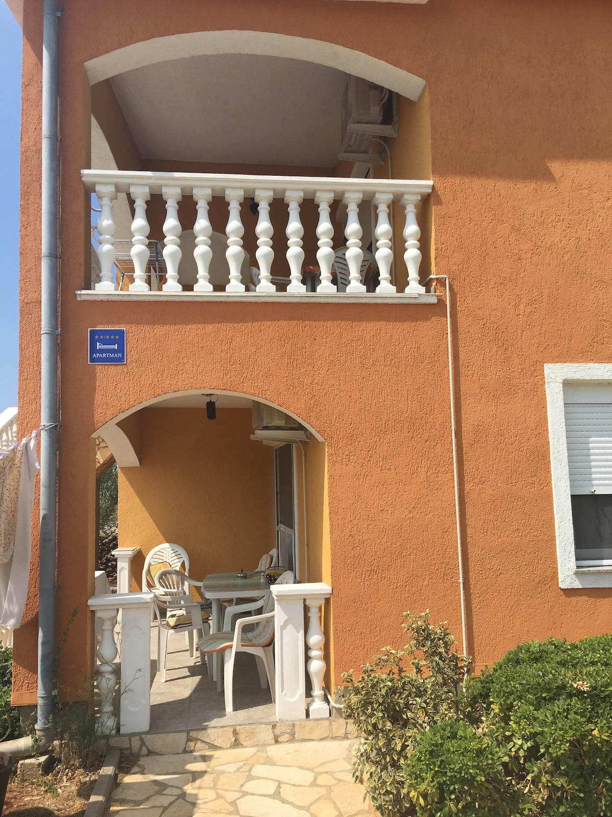 Dvosobni apartman s velikim ograđenim dvorištem i parkirnim mjestom, udaljen od mora 200m, od centra udaljen 300m. Apartman je za 4 osobe.