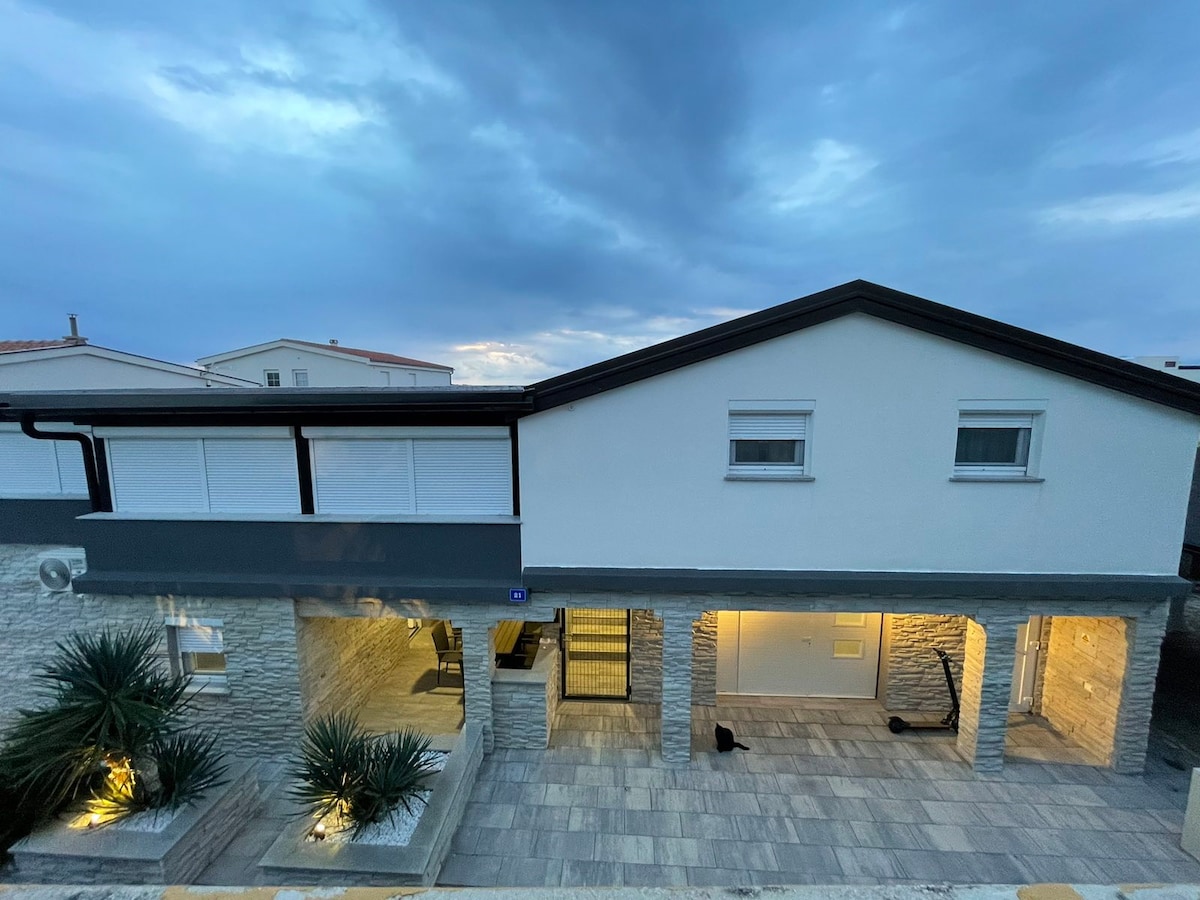 Ovaj jedinstveni smještaj uređen je u nesvakidašnjem stilu. U centru grada Paga, prava mala oaza sa tri spavaće sobe, prostranom kuhinjom, dnevnim boravkom, dvije kupaone i jednim odvojenim toaletom, veliko lijepo dvorište, bazen.