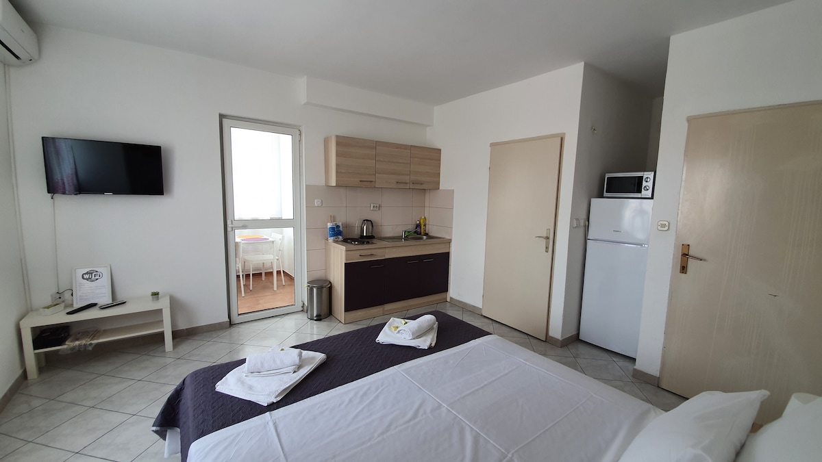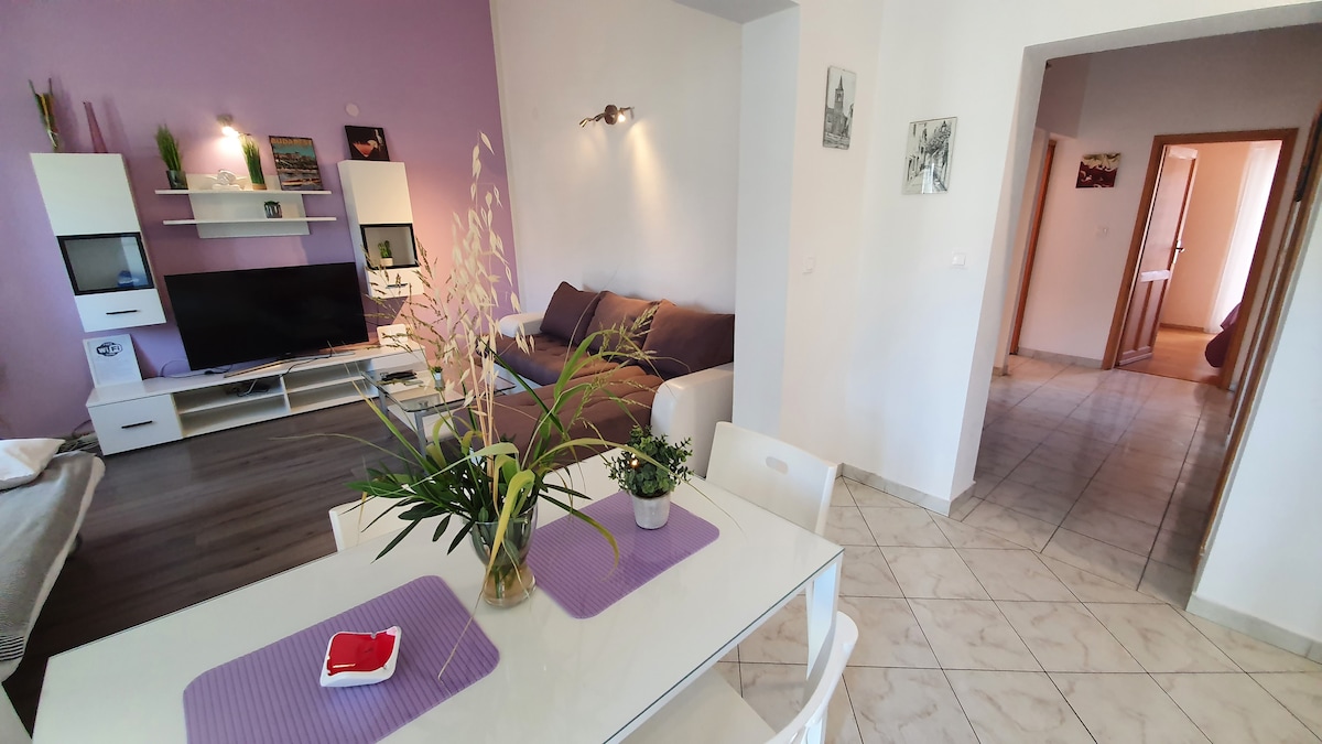 Apartman je udaljen 300 m od plaže prikladne za djecu,te 1 km udaljen od centra. Veličina apartmana je 50 m2, uključuje dvije zasebne spavaće sobe, dnevni boravak sa kaućom na rastezanje, kuhinja, kupaonica sa tuš kabinom.Kuhinja je potpuno opremljena,hladnjak,zamrzivač štednjak,posuđe. U sklopu apartmana su dvije terase opremljene sa vrtnim namještajem i pogledom na more. Dostupan je i kameni roštilj,perilica za rublje,fen,dječji krevetić,dječja stolica, garaža, klima uređaj