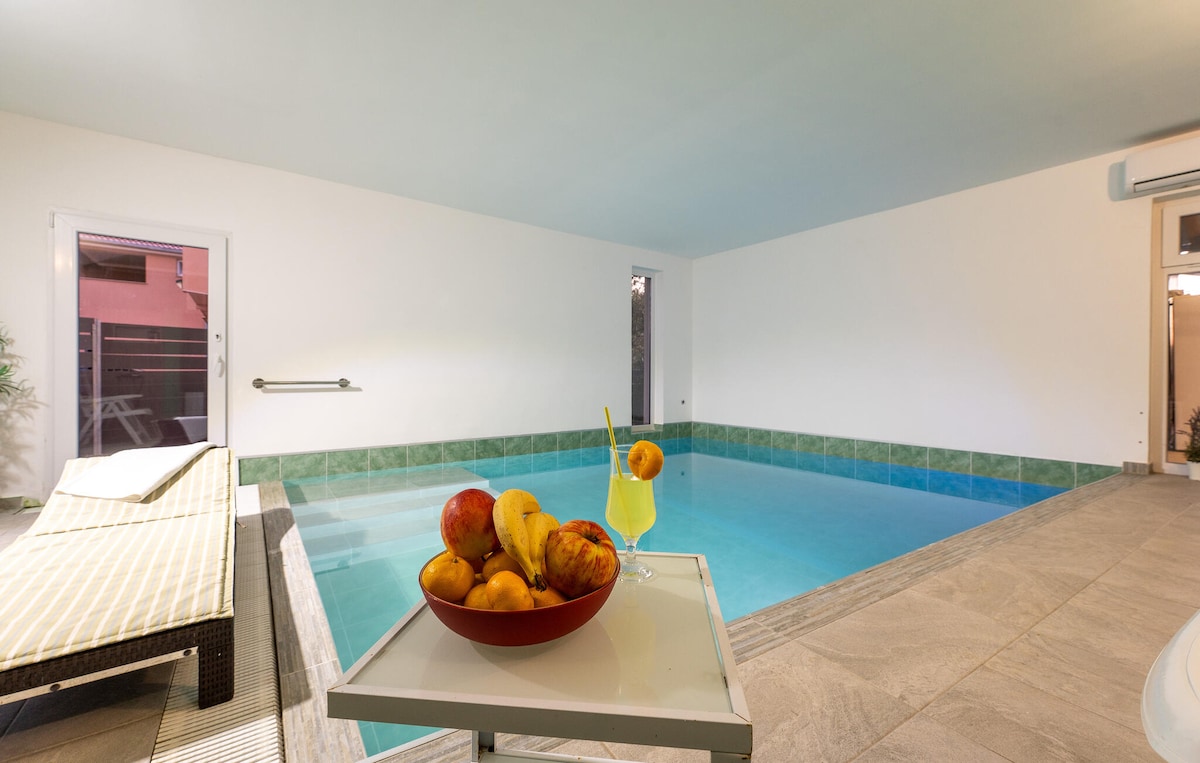 Attention!!! The property is family-friendly and couple-friendly. This unique apartment has a private pool opened May- mid October. It is full equipped with all the facilities you need for the relaxed vacation. It has a shower with the water massage and the sauna. The parking for two cars is free. It will impress you with the murals. First represents the map of the place so you can easily find every curiosity of Mandre. It is situated in a quiet neighborhood, only 300m straight to the beach.