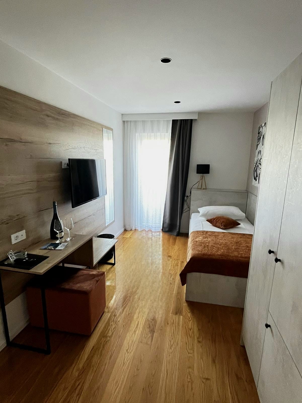 Room with balcony, private bathroom and refrigerator. Located on the second floor of the house. Satellite TV and Wi-Fi are available. The room has its own balcony that does not have a sea view but you can enjoy it. From the room is the entrance to your own bathroom which you do not share with anyone. The room has a filter coffee machine and kettle so you can make coffee or tea. The room is equipped with bed linen and towels which we change at the request of the guest.