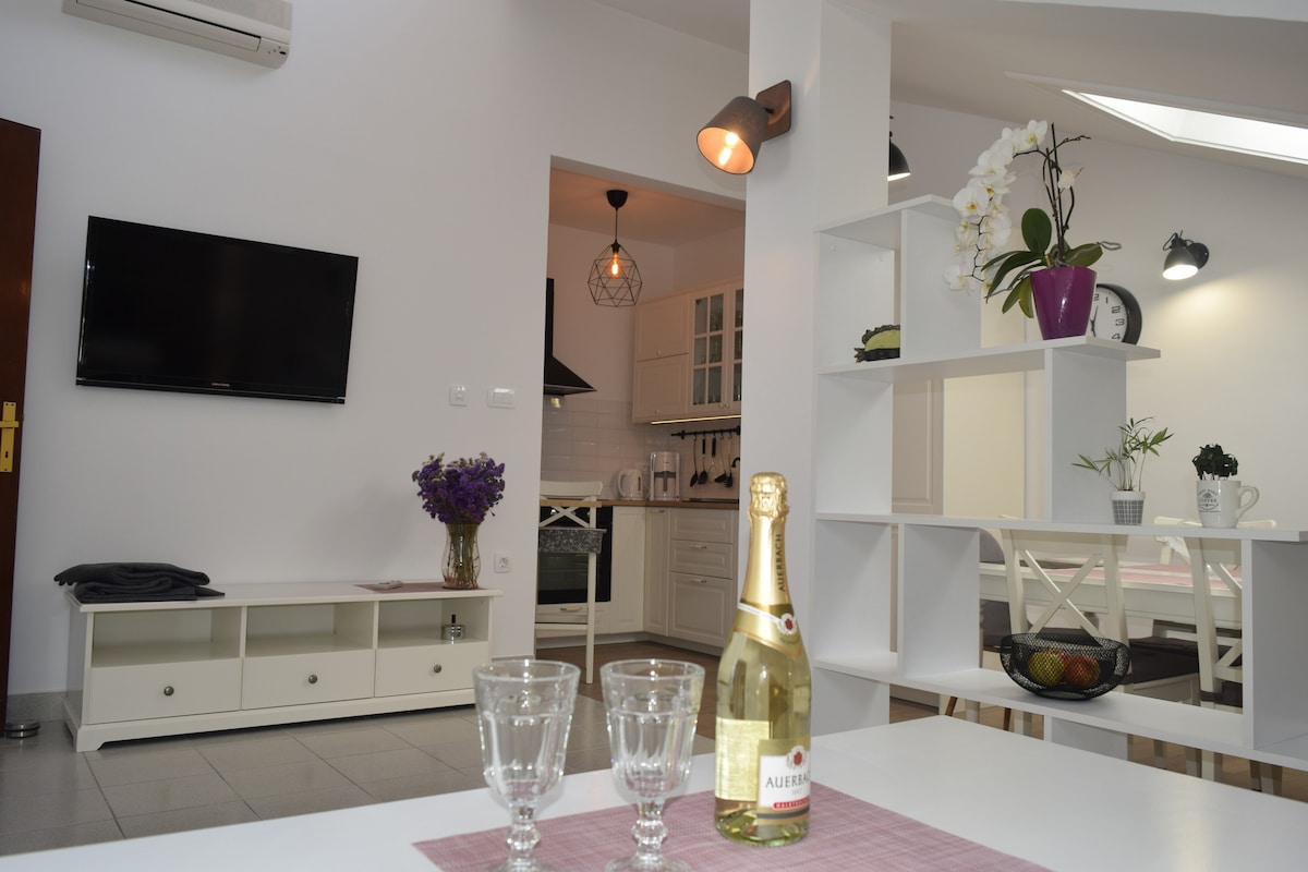 Place for a miraculous vacation! The Apartment 3 + 1 cca. 65m2 containes: *equipped kitchen *bathroom *living room *two bedrooms *balcony *bed sheets and towels *TV / SAT *WIFI *Air conditioning *extra bed for a fourth person ( 10,00 €.- per day) *baby cot on request *breakfast on request (€ 7.00 .- per person / per day)