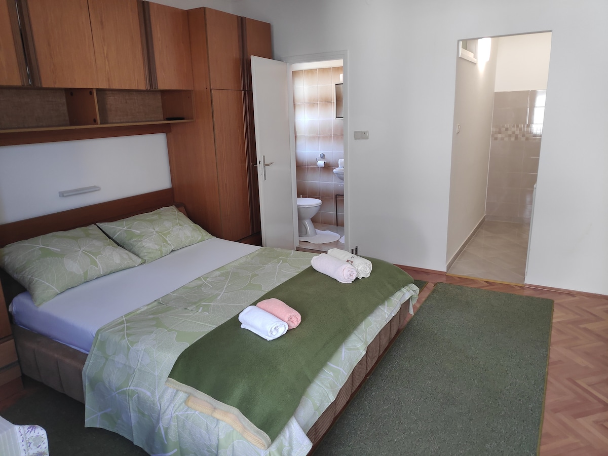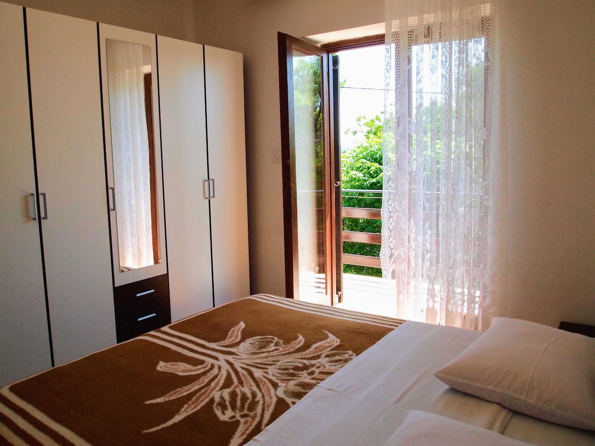Double bedroom with a bathroom and balcony, located on the first floor of a private house. Bed linen and towels are included. Guests have access to free WiFi and parking in the yard. Our house is located in Barbat on the island of Rab, just 100 meters from the sandy beach. Numerous restaurants, cafes, and shops are nearby.