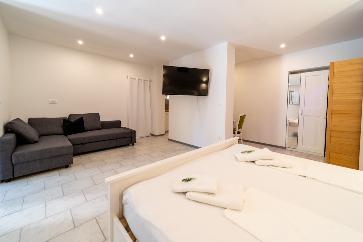 Novouređeni apartman za 4 do 6 osoba nalazi se u obiteljskoj kući sa posebnim ulazom. Pogodan je za obitelji sa djecom, također su i kućni ljubimci dobrodošli, u kući se nalaze 3 apartmana pa je moguće primiti i veće grupe. Trgovina se nalazi u neposrednoj blizini, centar grada je udaljen 1km. Domaćini su na raspolaganju u svako doba dana.