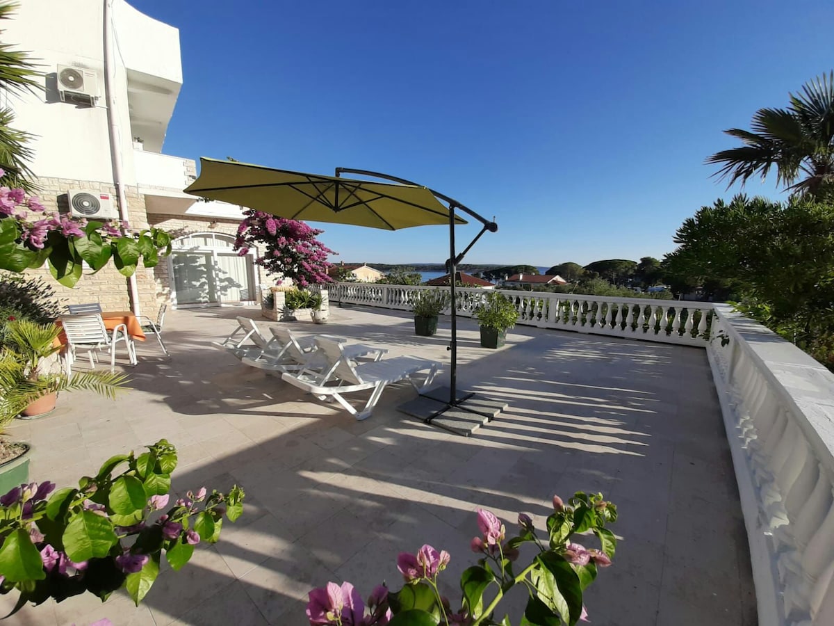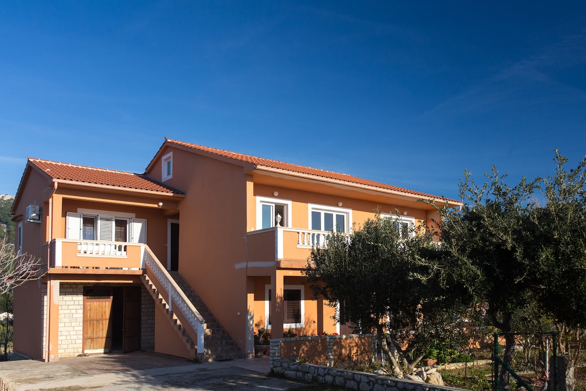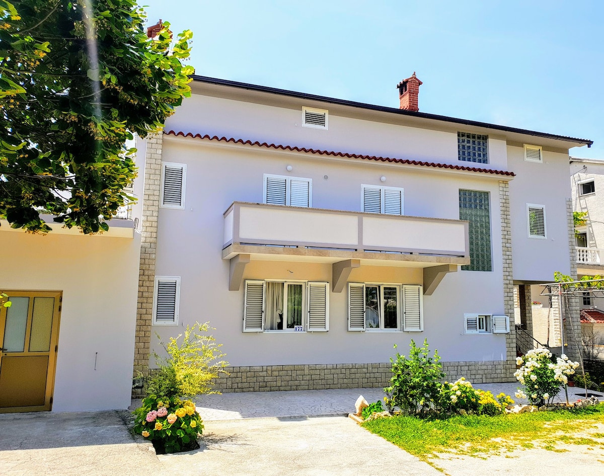U ponudi su jedan veći apartman ,jedan manji i studio.Apartmani su novo uređeni, sa osiguranim parkirnim mjestima, u samom centru . U blizini ACI marina, nogometno igralište, škola, plaža udaljena 200 metara. Mogućnost korištenja roštilja na vanjskoj terasi. Apartmani su sa pogledom na more i iz spavaćih soba i iz boravka. Svaka soba ima vlastiti balkon i vlastitu kupaonicu. Boravak uključujući kuhinju stol za objed i terasu sa pogledom na more. Kućni ljubimci dozvoljeni uz dodatnu nadoplatu.