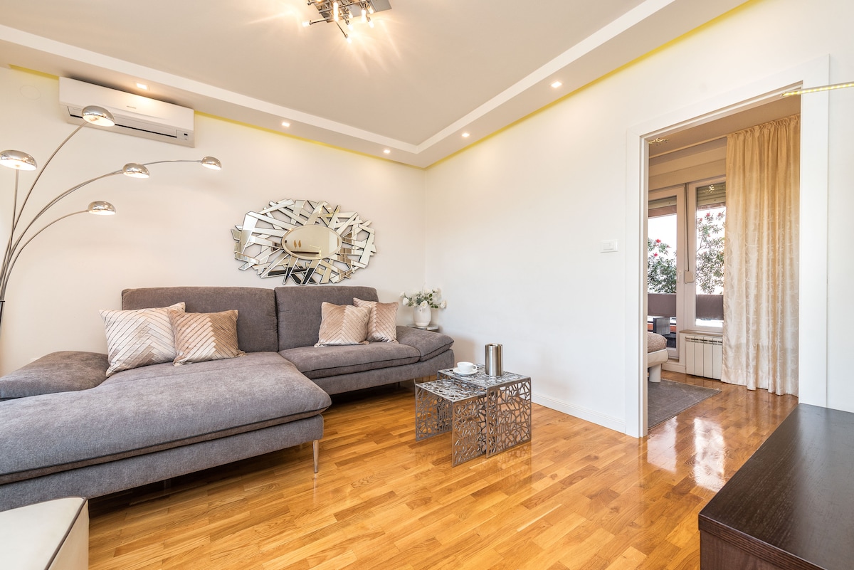 Spacious, modern and large apartment with 3 bedrooms, 1 bathroom and one toilett, 4 balconies for 7 people. 5 minutes from old town of Zadar, 20 m from the sea and 200 m from the beach. Free parking, air conditioning and internet are included.