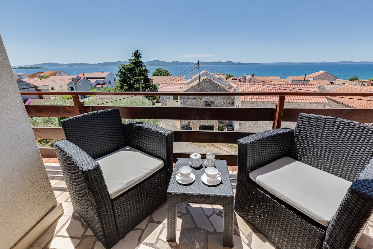 Enjoy the beautiful sea view with a glass of good Croatian wine in a family and friendly environment. Ideal for romantic walks by the sea . The facility is located in a quiet family village Diklo. Near the house there is a church, the distance from the beach and promenade is around 100 m as well as from the nearby caffe bar, grocery store,restaurant and children playground. The city center is only 6 km away, the nearest airport is Zadar Airport, 16 km away from the apartment.