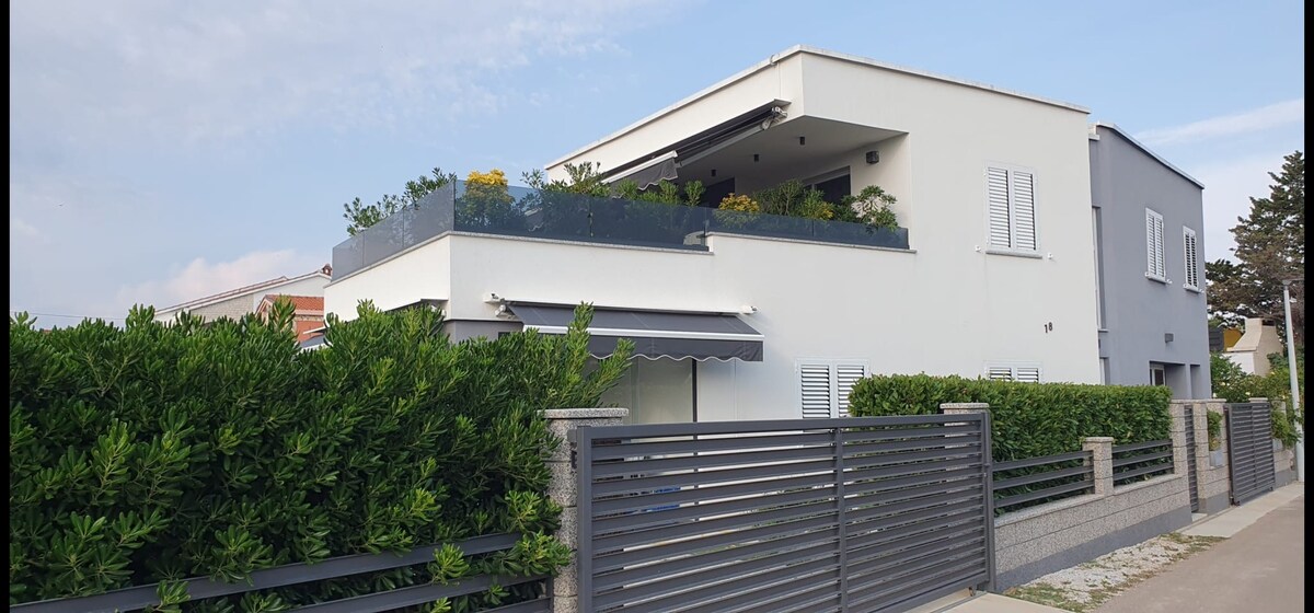 Kick back and relax in this calm, stylish studio. Cosy bedroom/living room with a private bathroom, fully equipped kitchen, air conditioning, and a cute patio. Free wifi and parking. Shared bbq. Top location! A beautiful beach is only 2 minutes walk. Close to a market, bakery, ice cream shop, restaurants and bars. Old town Zadar is only 5 km away. (Bus stop 50 m).