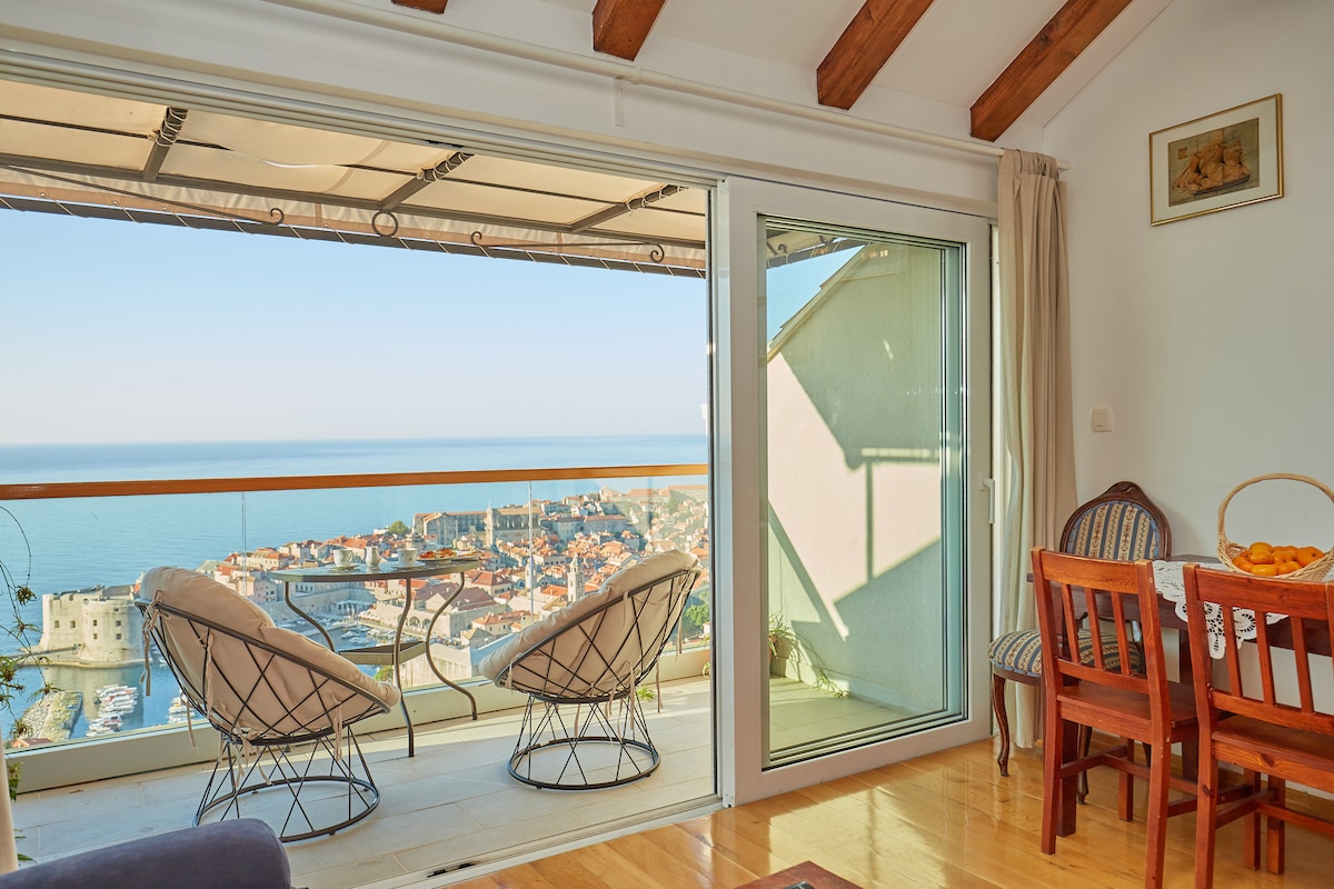 Enjoy sweeping, one-of-a-kind views of Dubrovnik's old town and the Mediterranean from your balcony. Tastefully furnished, comfortable, spacious and light-filled apartment in a quiet, charming hillside neighborhood, with plentiful amenities and reserved parking in front. The apartment has newly renovated bathroom and kitchen, and is equipped with Wi-Fi, A/C and heating, cable TV, Bluetooth speaker, washer and dryer, comfy mattresses and pillows, cotton bedding, luxury toiletries and more.