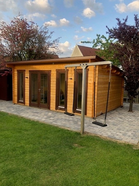 Stilfuld 25 m2 bjælkehytte. Egen lukket gårdhave med fliser og græsplane. Hytten er forsynet med klimaanlæg, lækkert køkkenafsnit med hvidevarer, samt bad og toilet. Parkeringsplads tæt på hytten. boligen og gårdhaven er afskærmet fra hovedhuset med egen indgang. Hytten er forsynet med sovesofa, “IKKE EN SENG”, med top madras 140 x 210. Den er beregnet til 2 voksne. Der er plissesolgardiner overalt, ikke mørklægningsgardiner. Mulighed for opladning af el-bil. Overdækket cykelparkering.