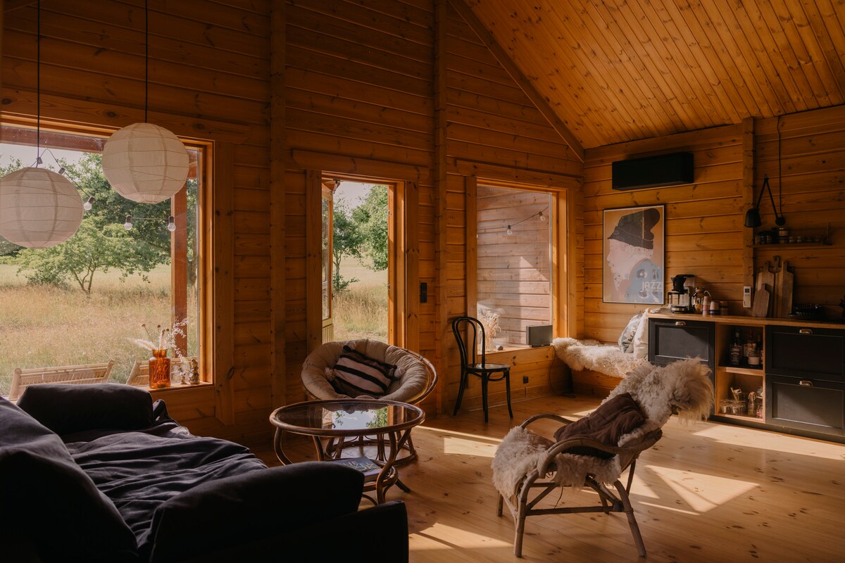 Rummelig og hyggelig bjælkehytte med stor have og plads til 8 gæster. Gåafstand til strand, natur og lokale gårdbutikker. Perfekt til familier, venner og par, der vil nyde roen året rundt. Nyd varmen fra brændeovn, vildmarksbad, indendørs spa og sauna i de kolde vintermåneder og åbn terrassedørene op mod haven og terrassen med aftensol og 10 minutters gåtur gennem en eng til stranden på de lune sommeraftener.