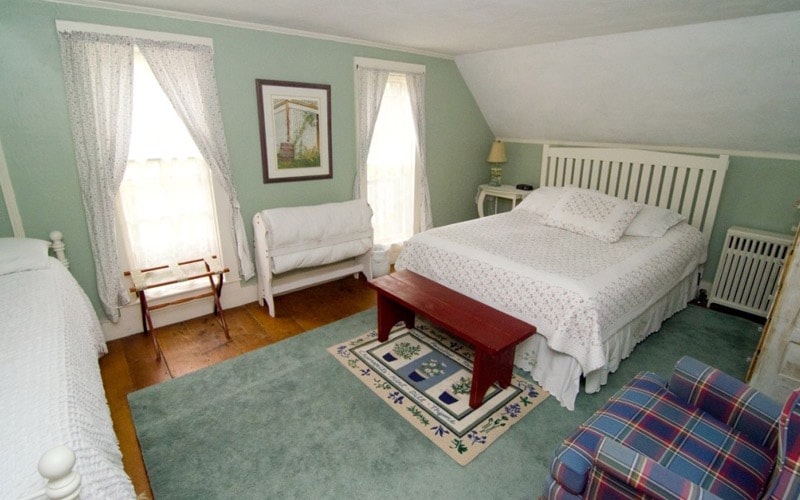Charles Hewes Room- Named for the first occupant of the house, the room has a queen-sized bed with an antique headboard, wide board floors, comfortable chair and a large private bathroom. Decorated in forest greens with cream accents, this room receives morning sun. The room includes breakfast. *A rollaway is available for this room. Please inquire. There is a small additional fee.