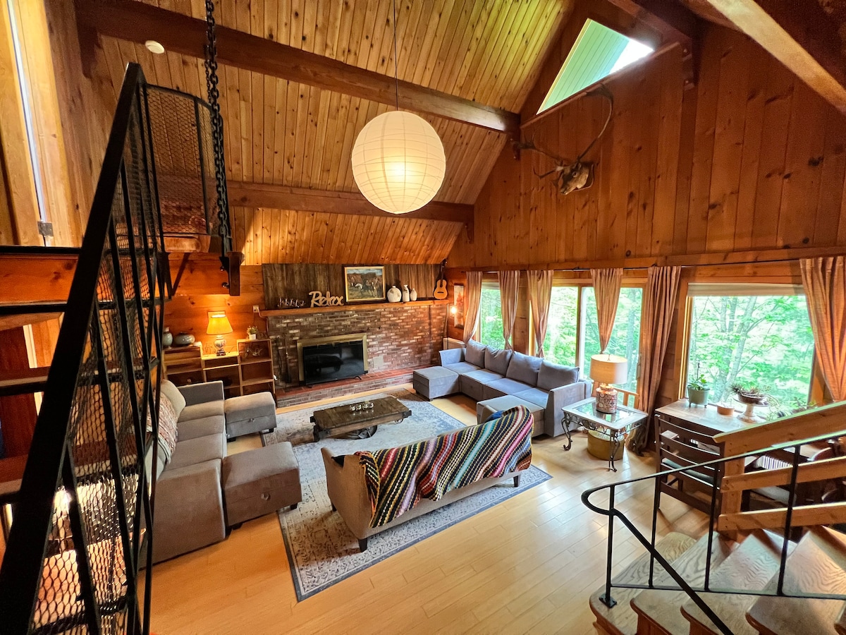 Our cozy chalet is nestled among tall trees in the heart of the Lakes Region. 5 minutes from Lake Winnipesaukee and 1 minute from Gunstock Mountain Resort, our hideaway offers instant access to the best of New England no matter the season, including hiking, beaches, kayaking, skiing, and more. Our family-friendly cottage has a two-story great room, a separate office, and an outdoor firepit. It is perfect for couples and families.