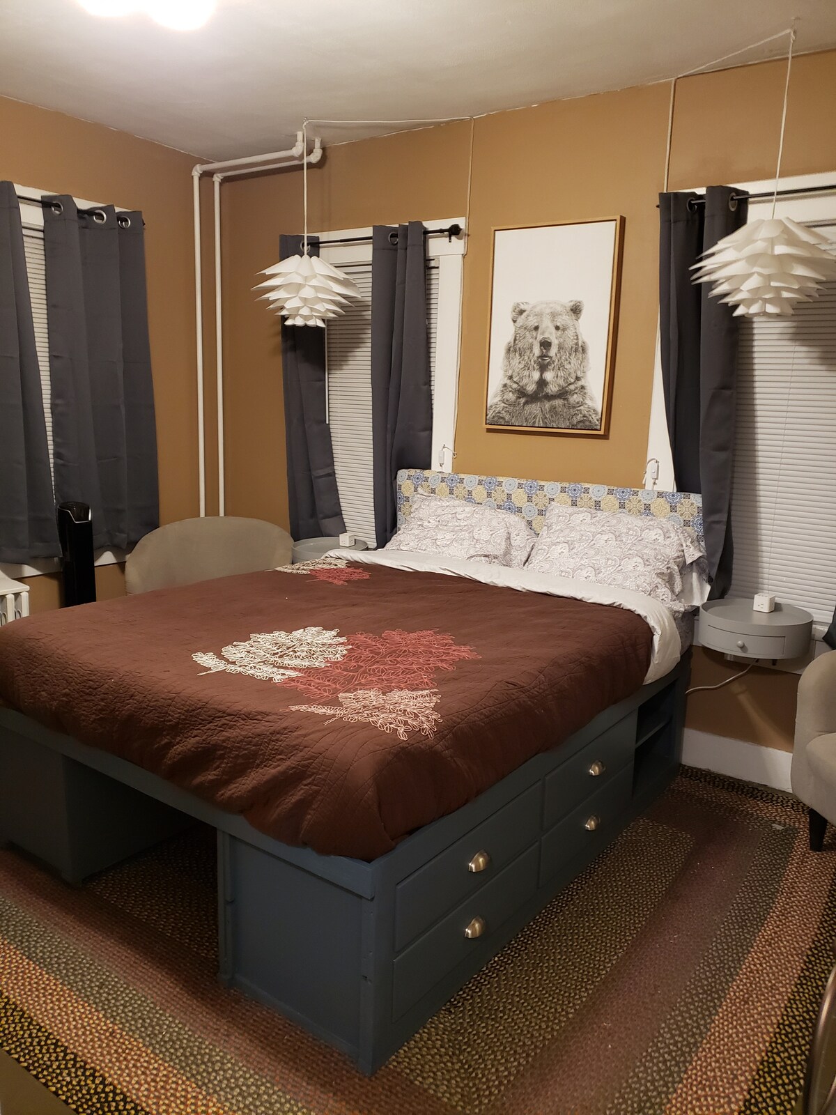 This is one room with a queen bed and a 3/4 bathroom. Breakfast nook, mini-fridge, microwave, coffee maker. This room comes with it's own seperate entrance, private bathroom, and private patio (Patio is not open in the winter). Also we have off street parking for one or two cars. I am new to hosting, so for now please a two person max. Walking distance to downtown. Less than 100 yards and you are in the middle of downtown Meredith.