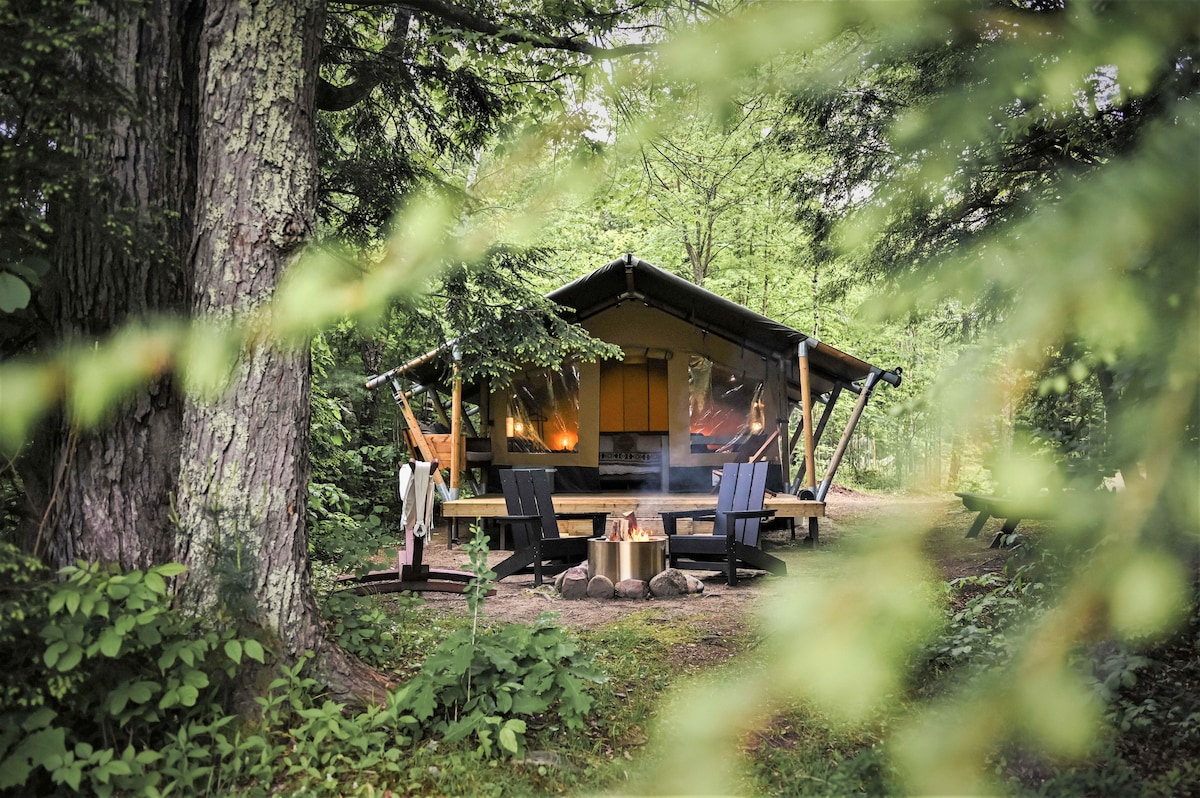 Enjoy the sounds of nature when you stay in this unique place. Our Glamping tent comes equipped with a comfy full bed and a twin bed plus all linens. Perfect for friends or family stays. Your own private spot with a charcoal grill and fire pit. Head over to Basecamp Lodge common space for guests. There we provide 2 baths, full kitchen, TV, WIFI, Workspace, a gift shop to browse our custom-made cutting boards, T-shirts, plus amazing maple syrup! Bring your hiking shoes and explore our trails :)