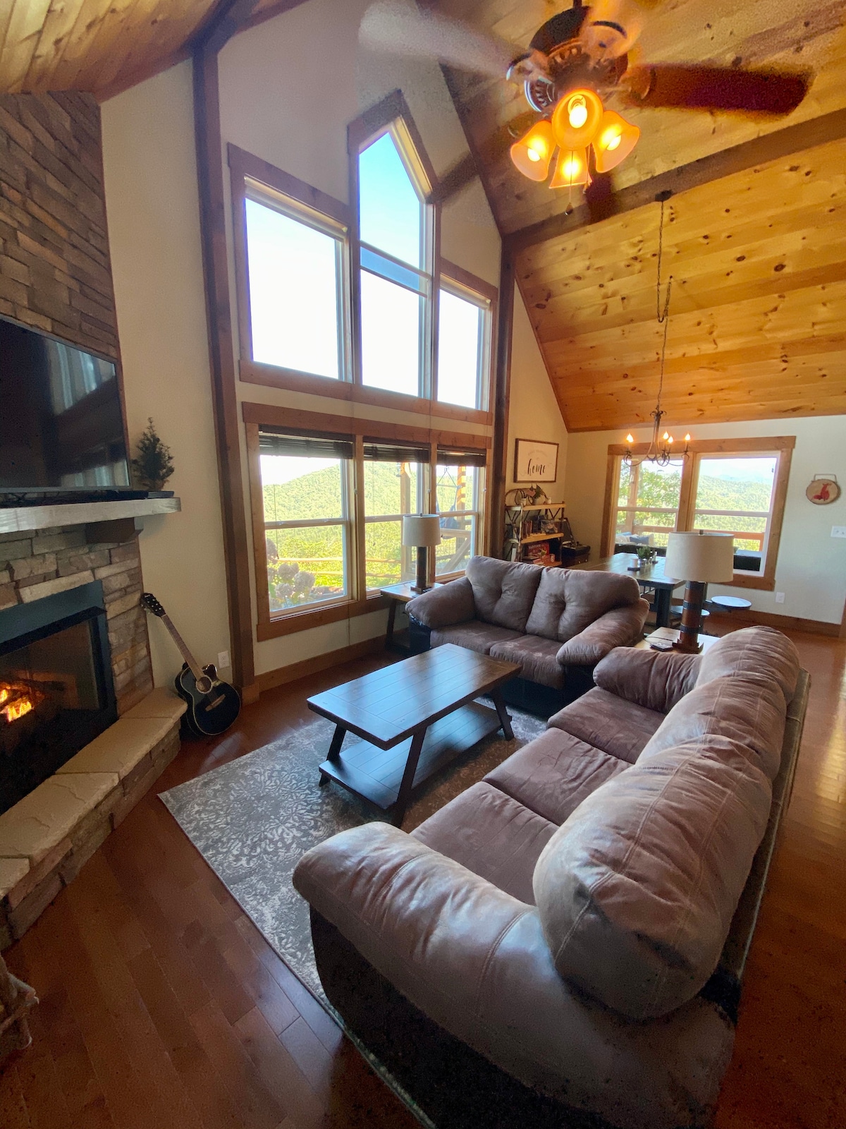 We are open! Sit in the rockers with your morning coffee, eat your meals at the kitchen table or sit in front of the fireplace all while enjoying the amazing view! The hot tub is located on the deck overlooking the beautiful Mountain View. We are just 20 minutes away from Bryson City and the Nantahala Outdoor Center, 10 minutes from Tsali Recreation, 25 minutes from the Smoky Mountain National Park, Cherokee and The Blue Ridge Parkway. There is a book in the cabin with other recommendations