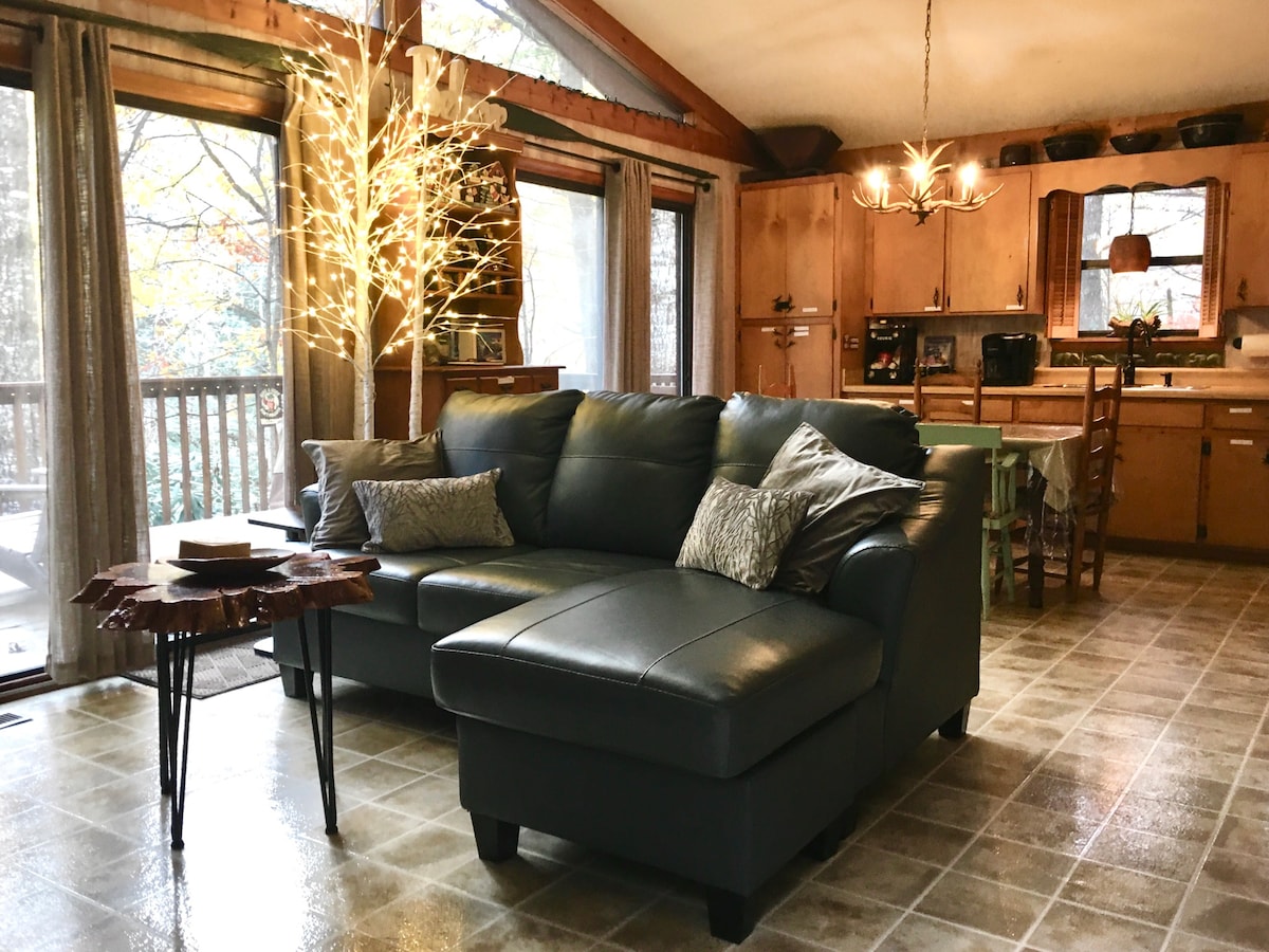 5卧室原木小屋•热水浴缸、游戏室、院子、火坑!