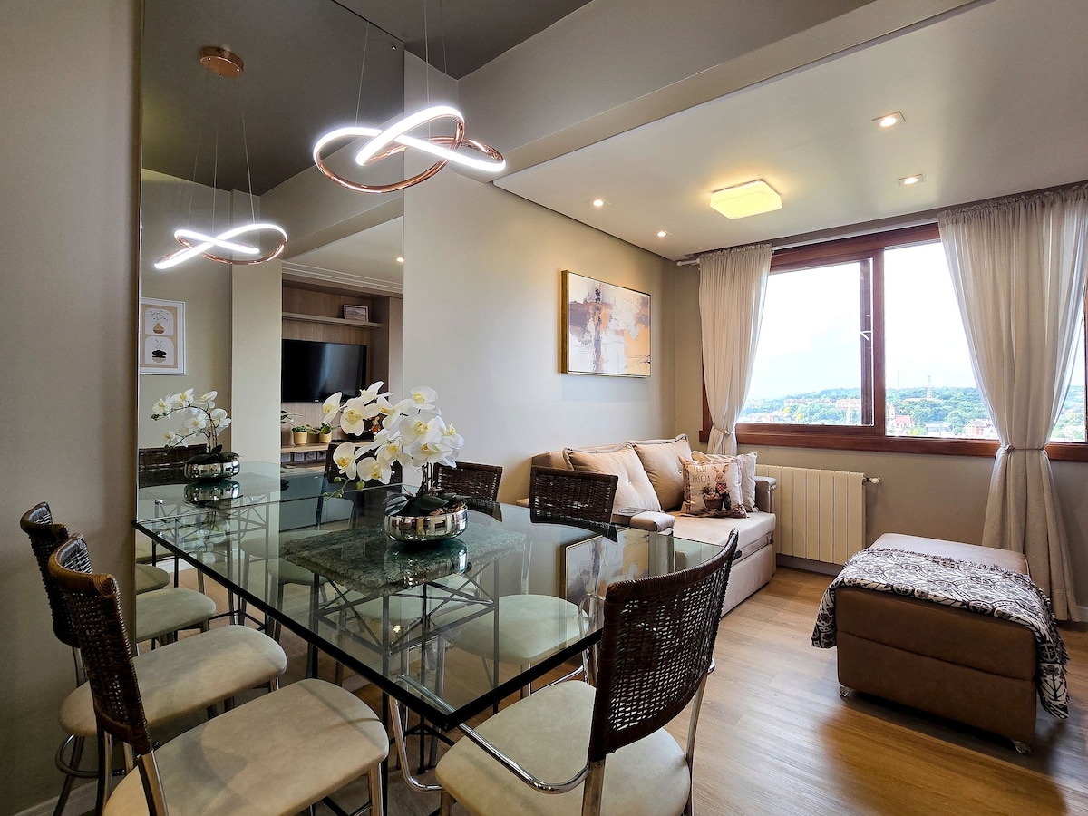 Apartamento decoração charmosa e aconchegante, contendo 2 suítes e 1 lavabo, a apenas 700m da Rua Coberta! Cozinha completa, espaço gourmet com Churrasqueira; Máquina de Lavar e secar roupas, sanduicheira, liquidificador; Split Quente e Frio na sala e nas suítes bem como TVs Smart com sinal aberto e Netflix; Wi-fi 33mb; Enxoval completo; Garagem para 2 carros, caminhe pelo centro sem tirar o carro da garagem; Perfeito para casais,famílias e viajantes a negócio, pois você se sentirá em casa.
