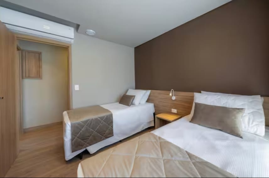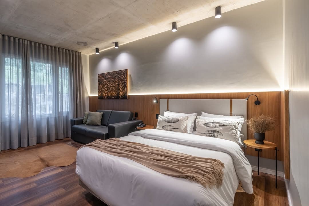 Espaço ideal para família ou amigos que buscam hospedagem segura e confortável entre Gramado e Canela. A suíte conta com 1 cama queen + 1 sofá cama com decoração em estilo rústico contemporâneo. Perfeita para relaxar e curtir o charme da Serra Gaúcha. O Hotel ainda oferece sem custo adicional : Estacionamento coberto. Piscina aquecida. Academia. Menu de experiencias: Chimarrão, yoga, marshmallow na fogueira Opcional (custo adicional) Café da manhã colonial maravilhoso!!