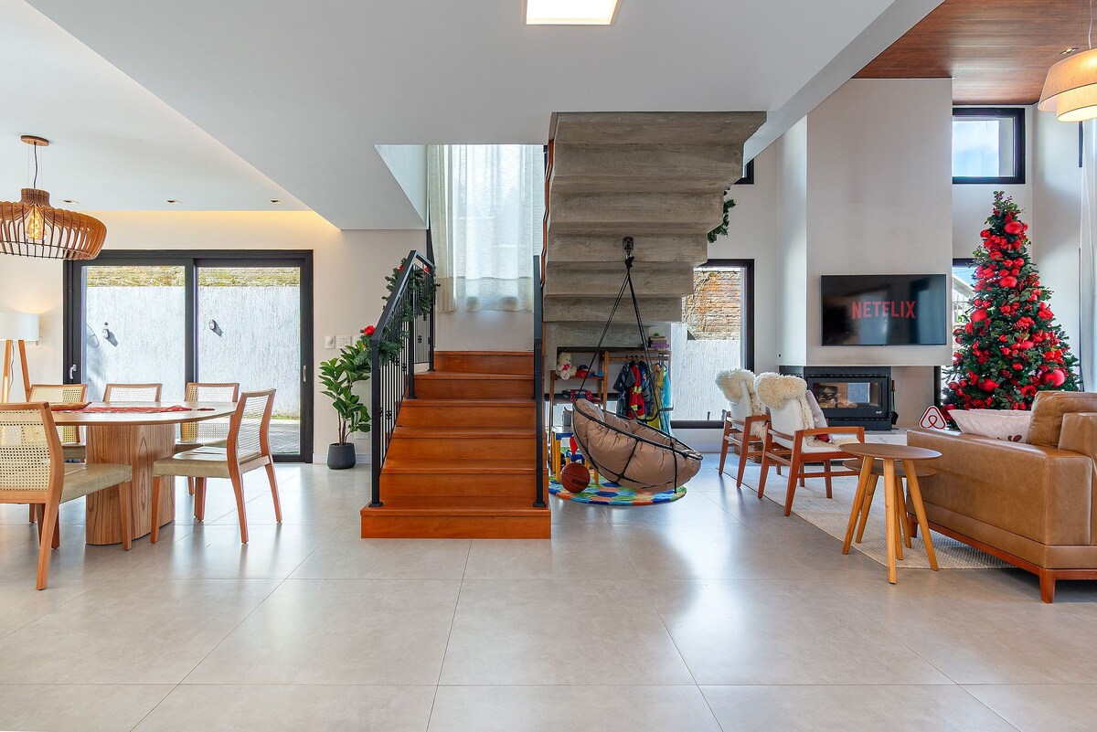 Excelente casa funcionalmente decorada, em condomínio próximo ao centro. Cozinha completa: churrasqueira, eletrodomésticos e utensílios. Sala de jantar: mesa para 6 pessoas. Sala de Estar: amplo e confortável sofá e mais duas poltronas em frente à lareira e TV. Varanda: mesa para 6 pessoas, espreguiçadeiras e rede. Cinco dormitórios (uma suíte) com camas queen/casal/solteiro. Piscina térmica e sala de ginástica do condomínio.