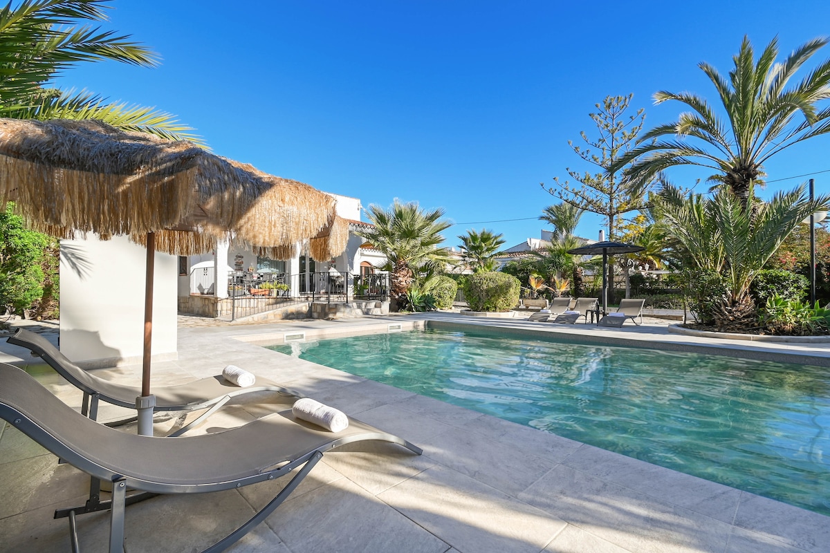 Design and brand new villa (independent with terraces with a private heated plunge pool) in a condo with swimming pool, garaje, kids play area and next to the beach. Full equiped kitchen. (220 meters in 3 levels) Stunning views of sea and mountains. Chalet independiente con parcela y piscina privada climatizada, en urbanización con piscina comunitaria, con acceso directo a la calle de la playa. Muy amplia, con Garaje. Zona muy tranquila. Frente a cala de piedra y a 300m playa arena
