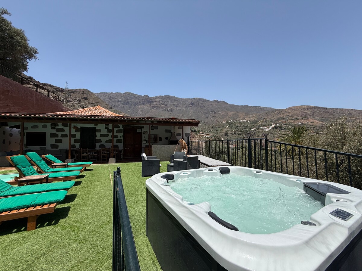Canary Cottage, with tourism licence, near Teror, inside Parque Rural de Doramas perfect for exploring the unspoilt wild north of Gran Canaria. We use photovoltaic panels to make housing more sustainable . Meditate by the fish pond in a typical Canarian courtyard after relaxing on the Balinese bed and in the extra-large Jacuzzi. Then prepare dinner in the outdoor kitchen, with its built-in BBQ and sound system, before dining from a wagon-wheel table.