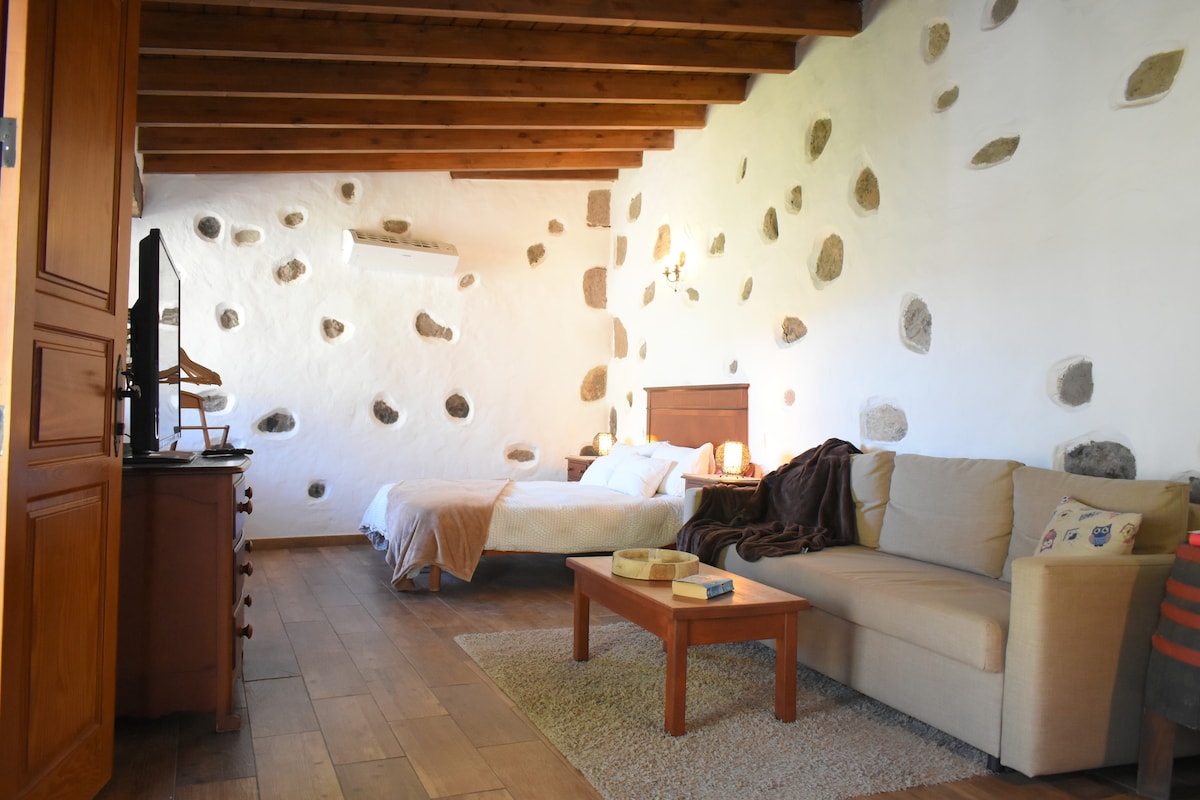 La casa está en las afueras del pueblo de San Bartolomé de Tirajana: "Tunte". En su origen era casa y alpendre de animales con la típica construcción de la época en las zonas rurales canarias, con gruesas paredes de piedra vista. La casa, por sus anchos muros y diáfanos espacios comunes es fresca en verano y acogedora en invierno, aunque dispone de climatización y chimenea de leña.