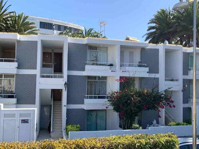 Apartamento de 1 dormitorio situado en la planta baja con terraza y jardín. Ubicado frente de la charca de Maspalomas, hay 2 terrazas a ambos lados del apartamento. Cuenta con salón-comedor, TV de pantalla plana, dormitorio completo y baño privado con plato ducha. La cocina viene totalmente equipada con nevera, vitroceramica, microondas, tostadora, tetera y cafetera. Hay una parada de autobús a 3 min andando y justo a 100 metros un pequeño centro comercial con restaurante y supermercado.