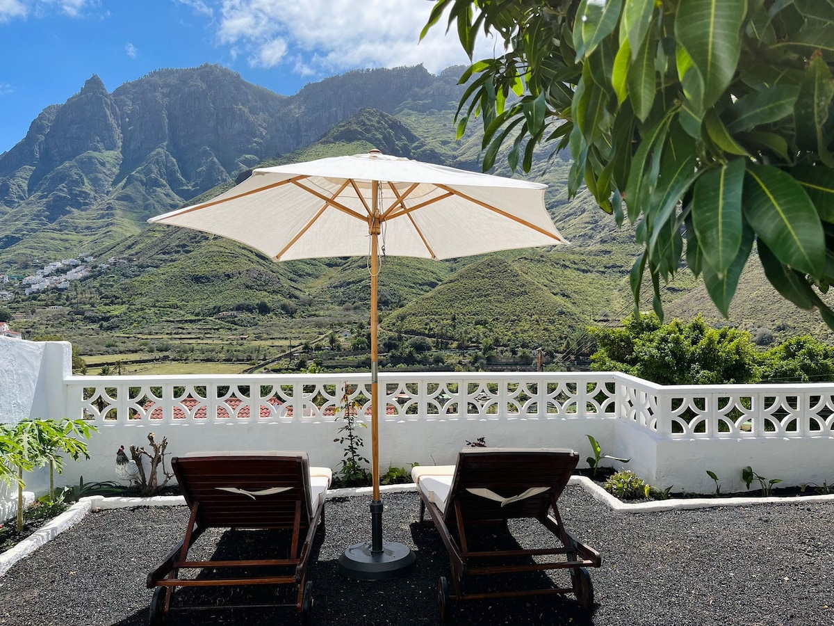 Ubicada en la ladera sur de la isla, en la caldera volcánica de Tirajana, un lugar idílico. La vista se abre 360 ° a los palmerales del valle y los picos volcánicos. Cuenta con una piscina con cascada, climatizada y tratada con sal. Está en una finca junto a otra casa de vacaciones para dos personas. Ambas casas son completamente independientes y tienen sus propios accesos y servicios, siendo el parking y la piscina las únicas áreas compartidas. Por lo tanto, la privacidad está garantizada.