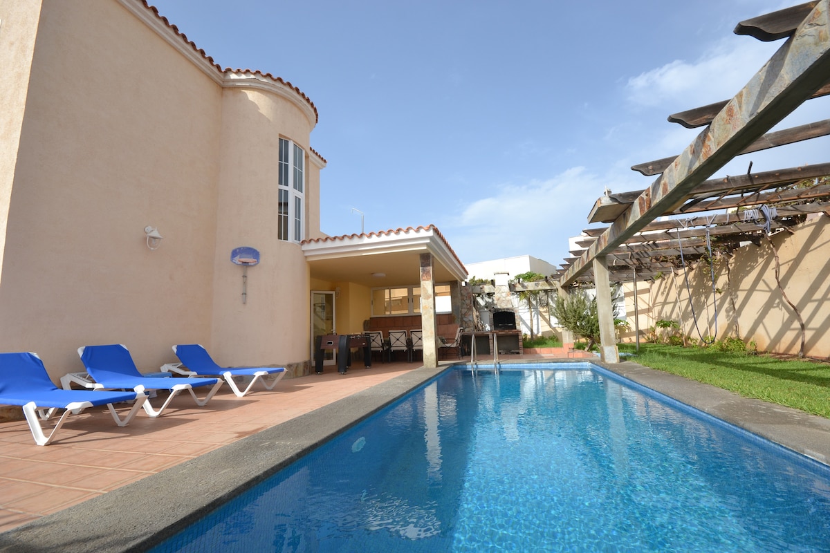 Wonderful villa with capacity for up to 8-10 people. It has all the comforts such as air conditioning, flat screen TV or washing machine. It offers a spacious garden with a private pool and sun loungers, barbecue facilities, free Wi-Fi and a well-equipped kitchen with oven, microwave and dishwasher. It is located in a quiet residential area, perfect for vacation.