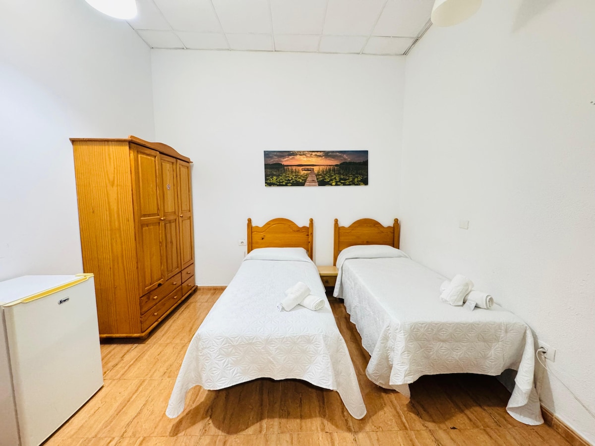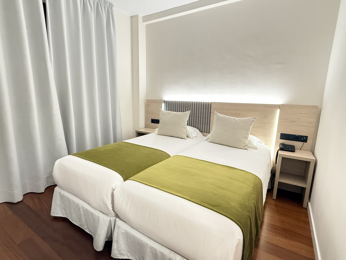 Disfruta de una estancia cómoda y luminosa en nuestra Habitación Doble Exterior, diseñada para el descanso y la tranquilidad. Dispone de dos camas individuales unidas que forman una amplia cama doble, ideal para un sueño reparador. Destaca por su luz natural, decoración moderna y ambiente acogedor. Equipada con aire acondicionado, WiFi de alta velocidad, Smart TV y baño privado con amenidades de calidad.