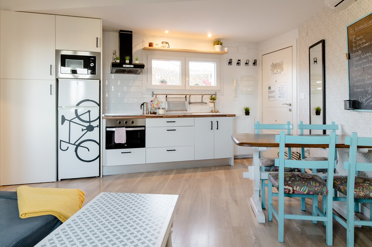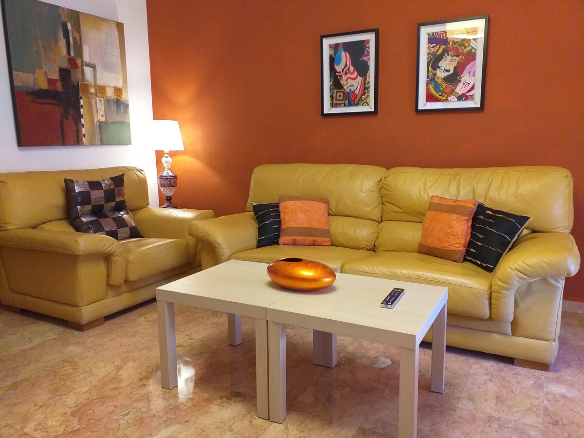 Apartamento estiloso con bonita terraza y vistas al mar. En un residencial con piscina y zonas comunes muy bonitas y cuidadas, y sobre todo tranquilo. Muy luminoso, terraza espectacular, dormitorio amplio con cama 1.5x2m (colchones nuevos), cocina con pasador, AA, Internet rápido, TV 50" (YouTube, Prime..). Cerca de todo tipo de servicios: Playa a 500m, supermercados, farmacia y restaurantes a menos de 5min a pie. Puerto deportivo a 10min, por paseo marítimo. Palacio congresos a 15min andando.
