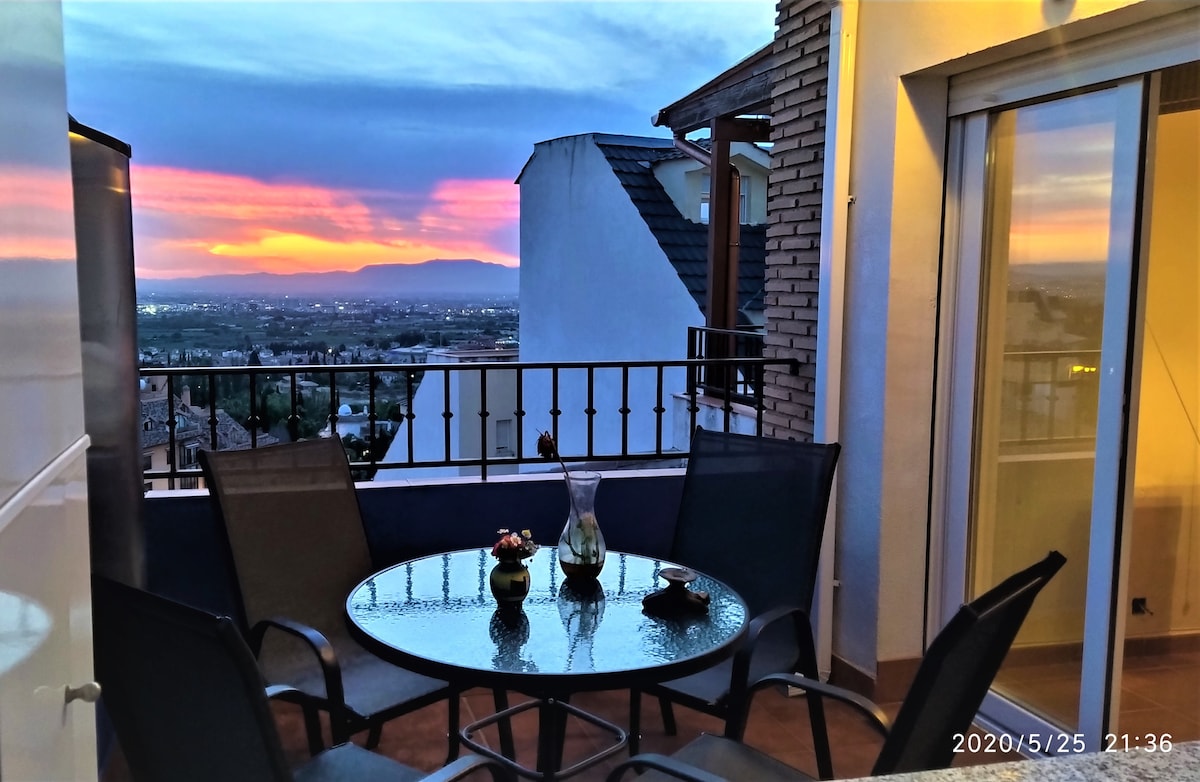 It has two beautiful terraces that will delight a very special stay, offering us a place to relax and enjoy a beautiful sunset. The flat is very sunny and has two garage spaces and access to the house without steps, so it can be accessed with a cart or a wheelchair. The area is very quiet and closed to the great nature of Sierra Nevada and Los Cahorros, and is only 7,5 km from the Alhambra and Granada. The house will be delivered completely clean with disinfectant products.