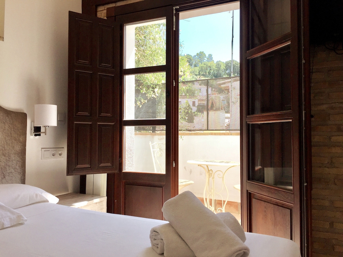 Ambientes inspirados en todo momento en la cultura nazarí, es por ello que los suelos y azulejería hidráulica han sido llevados a cabo de forma artesanal, respetando la geometría árabe que tanto caracteriza a Granada. Desde la pequeña terraza de la habitación, se puede disfrutar de uno de los atardeceres más bellos del mundo, pudiendo vislumbrar la Alhambra, la Torre de la Vela y el Albaycín.