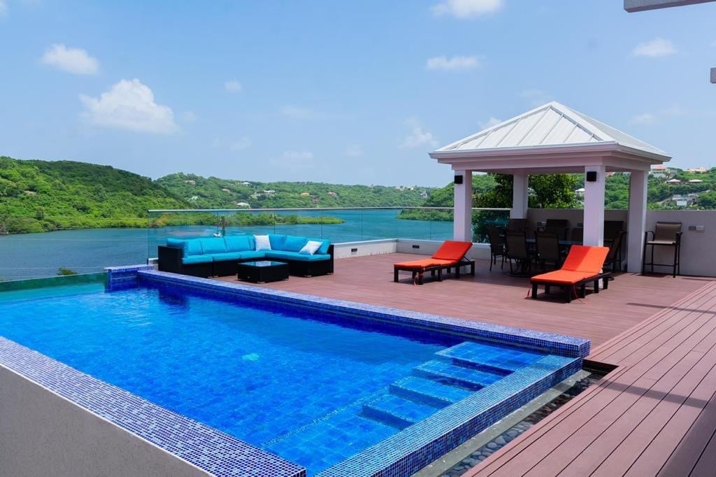 Up on a hill ,Overlooking Port Louis Marina in central St George’s. Enjoy easy access to grocery stores, restaurants and 15 minutes from Grand Anse Beach. Enjoy a swim in the pool, or a cocktail on the patio amongst the tropical garden. 5mm work to the property from the main road bus stop , with onsite parking. Bedroom consists of AC & ensuit bathroom, leading into open plan lounge, dining room & kitchen. Large windows allow for full view of stunning garden & marina below.