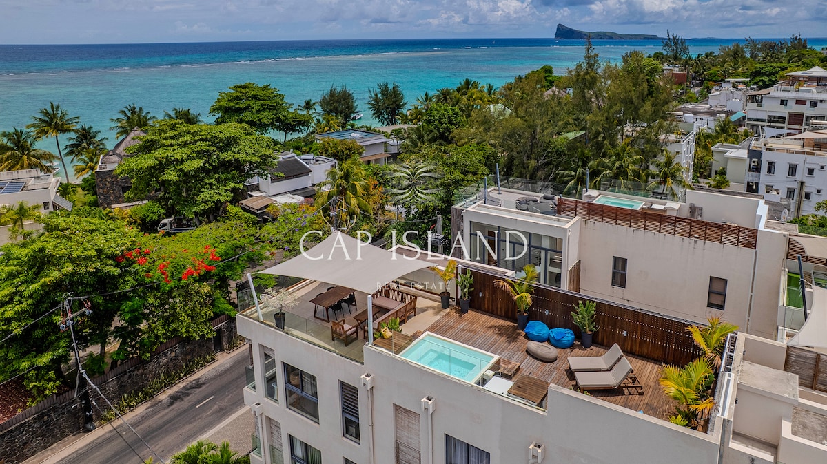 Appartement en duplex au 2em et dernier étage d’une résidence qui fait face à la plage de Bain Bœuf et l’île du coin de mire . Idéalement placé dans le nord de l’île Maurice , à 10 mn de Grand Baie et 5 de Cap Malheureux . La terrasse avec salon , table à manger et barbecue au milieu de la cime des palmiers offrant un aperçu mer , ainsi qu’une terrasse solarium , agrémentent l’appartement. Accès à la mer à 50 mètres, piscine, salle de gym, jardin commun et 2 paddles à votre disposition .