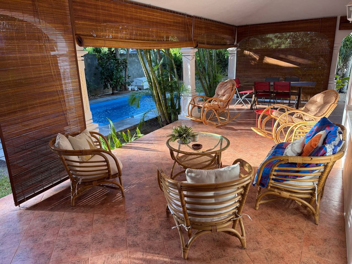 Unique private fully a/c villa in Mauritius near the sea in the North. Well equipped open kitchen. Tropical 2500 Sqm landscaped garden harboring exotic fruit trees. Inviting blue pool, 2 terraces to enjoy & relax. Cottage next to the pool. Every detail of this comfortable villa will create a perfect atmosphere for your holidays. The owners, globe-trotters, decorated the place with pieces and art from their escapades all over Asia & Africa. Large stone walls around the property for privacy.