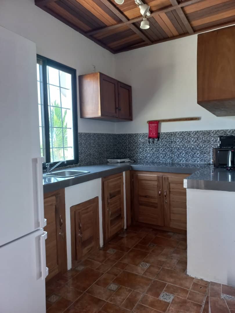 Maison avec jardin et piscine située dans le quartier de Mboamanga, facilement accessible en voiture, proche de la plage du centre d'accueil, du débarcadère et de la Marina. Propriété climatisée. Cuisine équipée avec cuisinière mixte , réfrigérateur congélateur, four à micro ondes. Gardien présent sur place qui s'occupe aussi de l'entretien de la piscine. Une personne habitant Kribi vous accueillera et sera joignable si besoin durant votre séjour