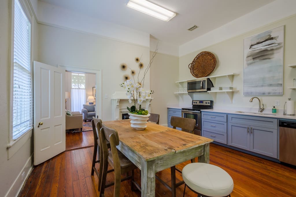 Make yourself at home in this cozy, artist-designed apartment in the heart of the DeTonti historic district, just steps from downtown Mobile. This true mid-century gem is right around the corner from Greer’s Market and rooftop bar, local coffee shop favorite Nova Espresso, and a short walk or bike ride to other area restaurants, shops, and museums. Off street parking just a few blocks from the parade route make this a great Mardi Gras landing pad for couples or small families.