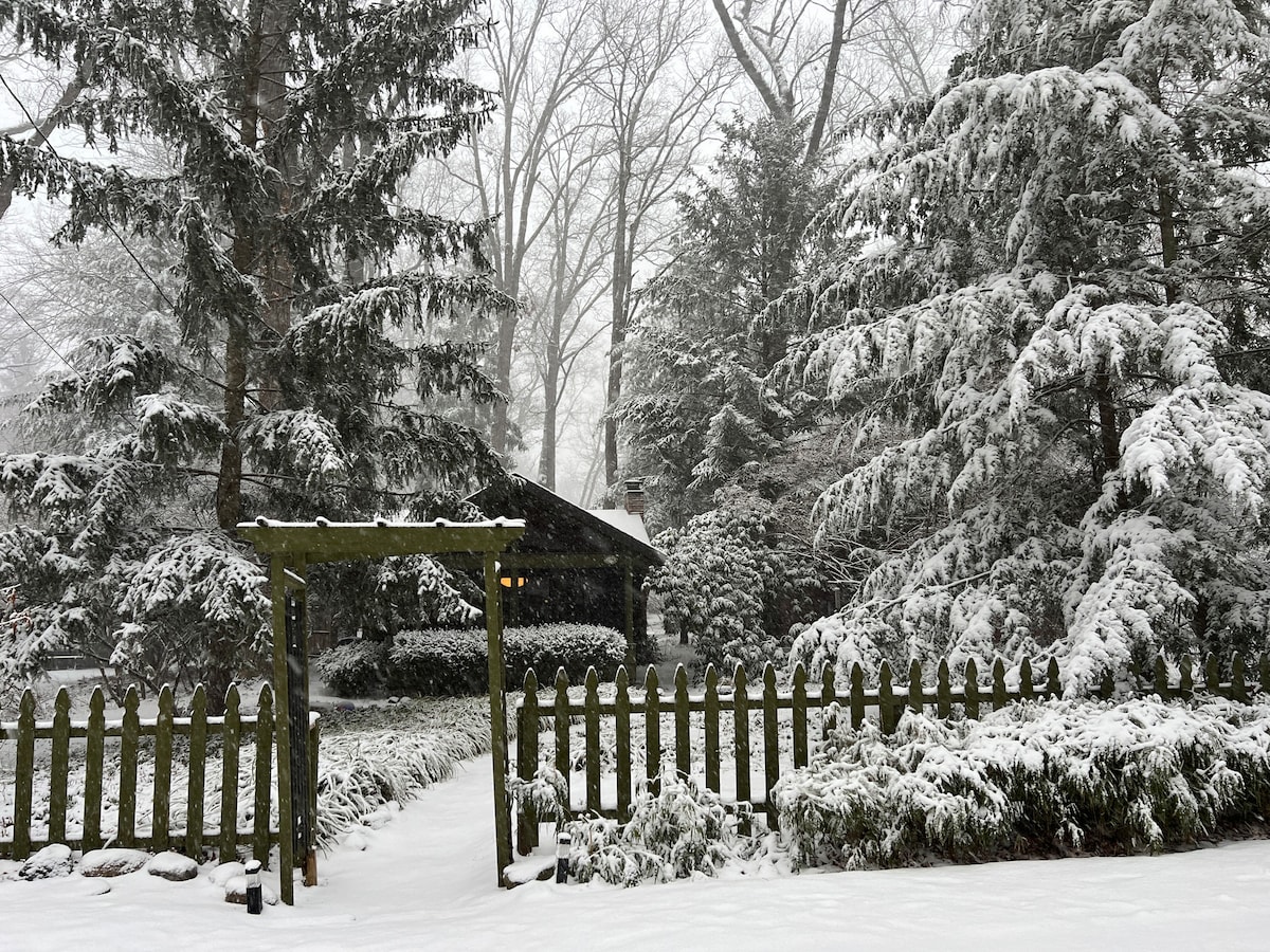 Come fall in love with Michiana Shores, we promise you'll love the peace and quiet. Our charming cottage sits back tucked away, nestled among pine trees and twinkle lights. Roast marshmallows while sitting around the fire with 6 modern adirondack chairs, take a stroll to the beach, ride bikes, BBQ, watch the sunset along lakeshore drive. Play tennis or pickle at the local park. 10 minute walk to the beach. Far away enough to relax yet close enough to new Buffalo, Union Pier or Long Beach