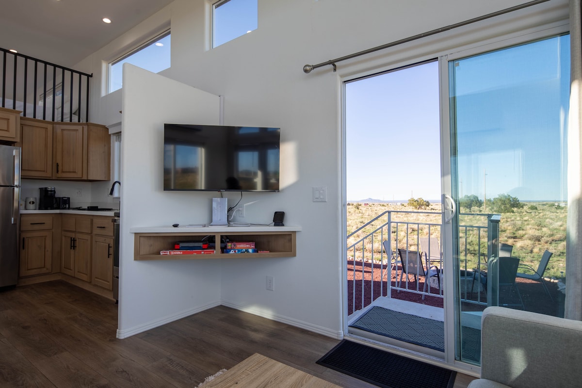Welcome to your new home - 20 min. from Grand Canyon South Rim and nesting on 12 acres of private, serene, and gorgeous nature with clear view of nearby mountains and the stars. Our 529 sqft, 2-bedroom and 1-bath * new-construction * tiny home is pet-friendly and comes with a fully-stocked kitchen, balcony outlook overlooking the desert landscape, fast internet (Starlink), outdoor deck, full-sized laundry machines, and all the luxury comforts and amenities of a modern home.