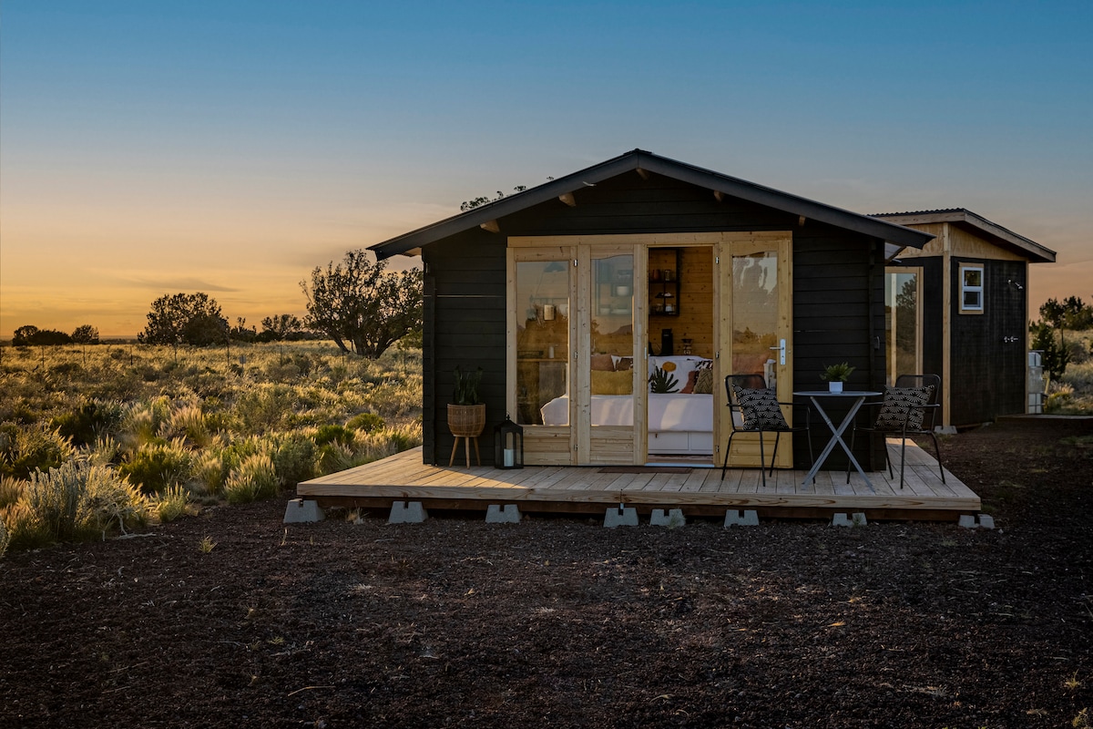Keep warm this winter and enjoy indoor hot showers! Stay longer and save! Discounts added on your 2nd (+) nights through end of April! Discover comfort and serenity in our tiny house, just 30 minutes from the Grand Canyon entrance. Enjoy breathtaking sunrises over the mountains, stargaze without light pollution, and kick back in our 15-acre (6 ha) property. Perfect for nature lovers and adventurers, this off-grid gem offers modern amenities, cozy indoor living, and expansive outdoor space.